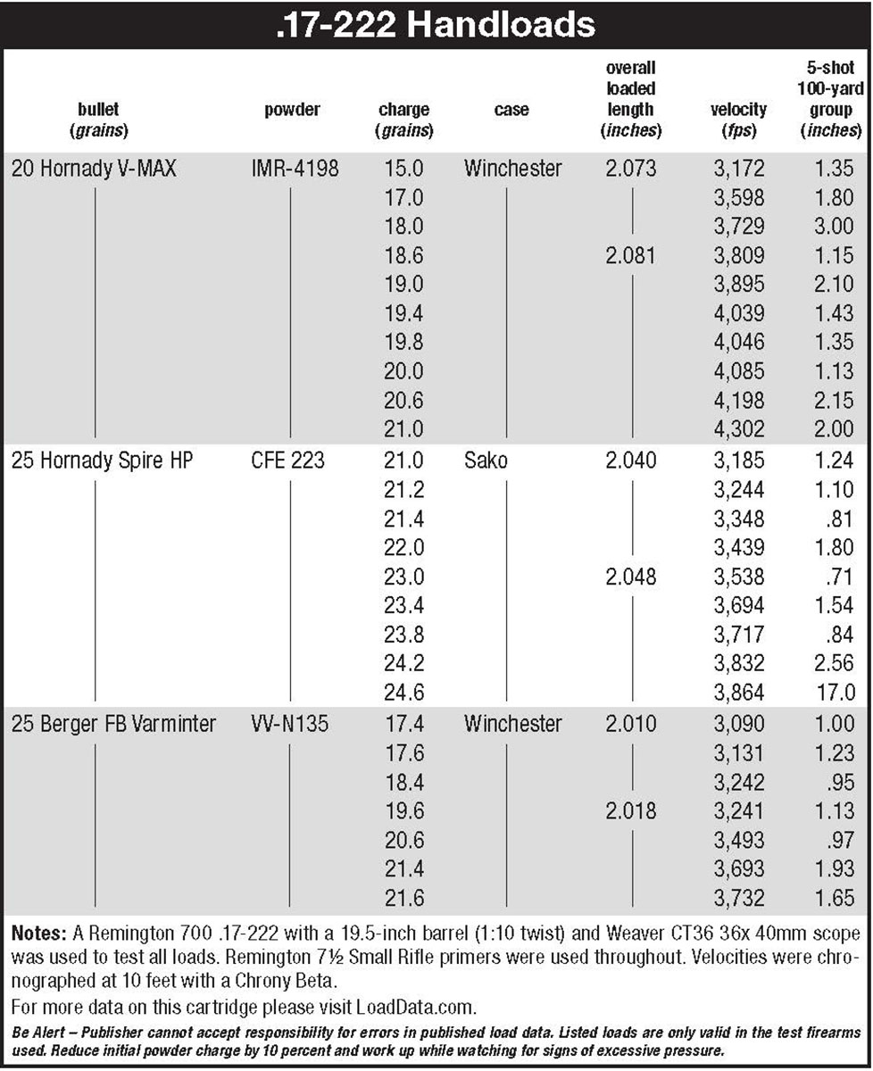 Printed modern 17-222 load data from established credible sources is nearly nonexistent; both Hodgdon and Lee currently list the cartridge, but both data sets are identical, indicating a single source. P.O. Ackley’s Handbook for Shooters and Reloaders (1962) and Pacific’s Rifle & Pistol Cartridge Handloading Manual (1968) list only two powders for the 17-222, IMR-4198 and IMR-3031. The lists recommend IMR-4198 for 20-grain bullets and both powders for 25-grain bullets. In fact, like the Hodgdon and Lee data, all 17-222 loads in both the Ackley and Pacific manuals are identical. Handloaders can use these two extruded IMR powders, of course, but perhaps we can do better with improved modern powders.