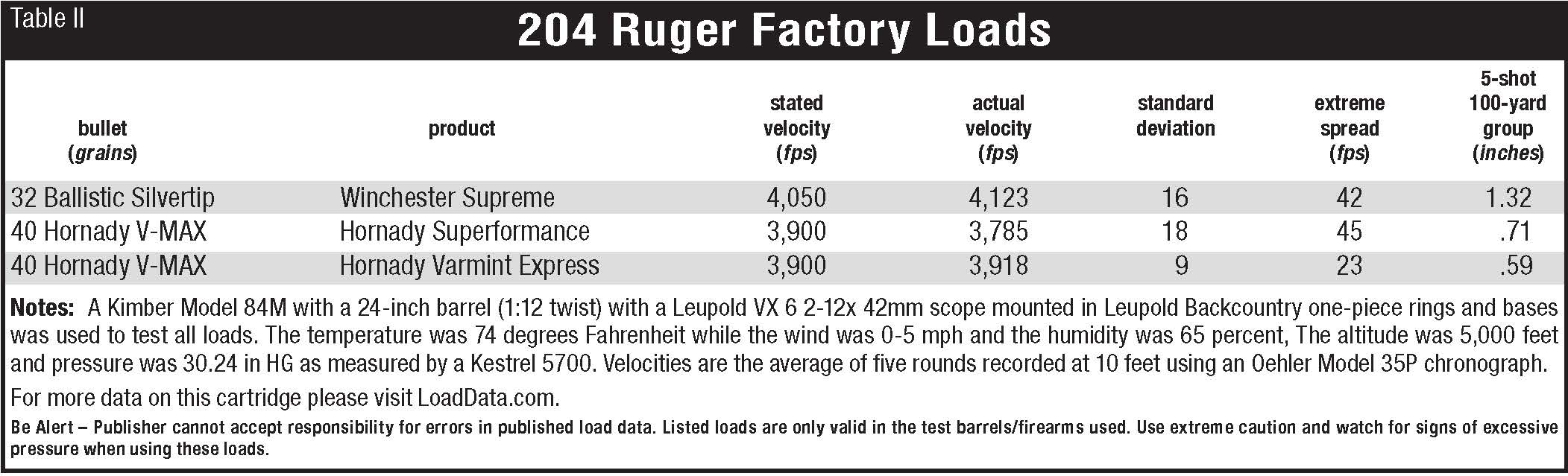 All of the loads in the included table performed decent, but there certainly were a few outliers in terms of performance. With this being an older rifle and not wanting to stress the barrel with high-velocity loads, I settled on a heavier bullet, the Hornady 40-grain V-MAX. Using Shooters World Precision Rifle Powder, the rifle assembled a .46-inch group with this bullet at 3,512 feet per second (fps). I was more than happy with that and settled on that load to take to the SPUR Ranch to hunt entrenched alfalfa-eating vermin. In addition to this load, I also decided to take some Hornady Varmint Express ammunition in 204 Ruger. In testing, they printed within 1 inch of each other vertically, and windage-wise, there was no discernable difference. It is always nice to have the option to buy ammunition that would work in a pinch without having to mess with the zero of a rifle.
