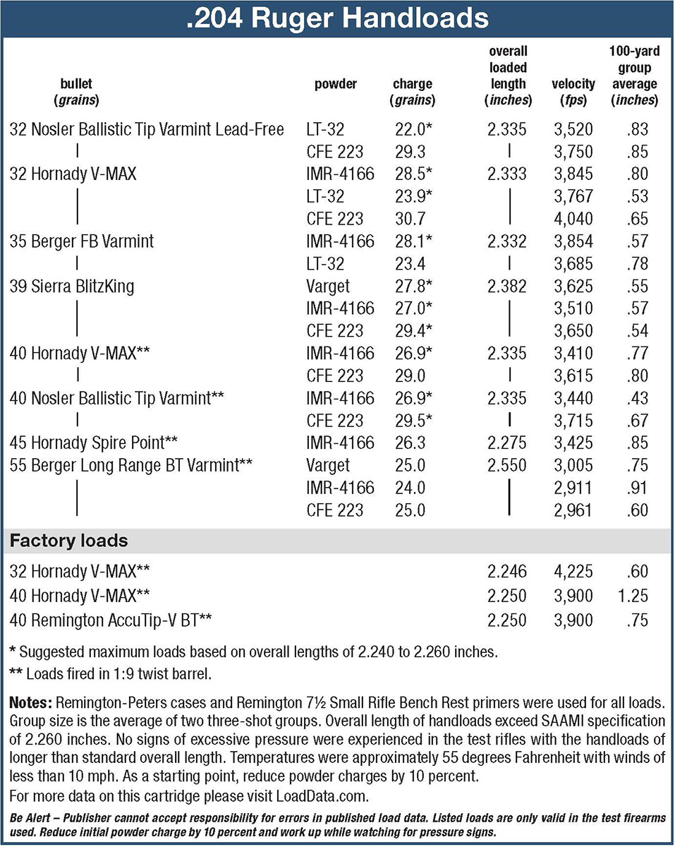 Two rifles chambered for the 204 Ruger cartridge were used to test the loads in the table. These include a semi-custom 204 built by Dale Hegstrom of Little Crow Gunworks on a pillar-bedded Remington 700 action with a 24-inch, stainless steel, Lothar Walther 1:9 twist barrel and H-S Precision synthetic stock; and a synthetic-stocked, pillar-bedded CZ 527 Varmint with a 24-inch Lilja sporter-weight, 1:12 twist barrel that has a match chamber. Both rifles produce sub-.75 inch groups with a variety of loads.