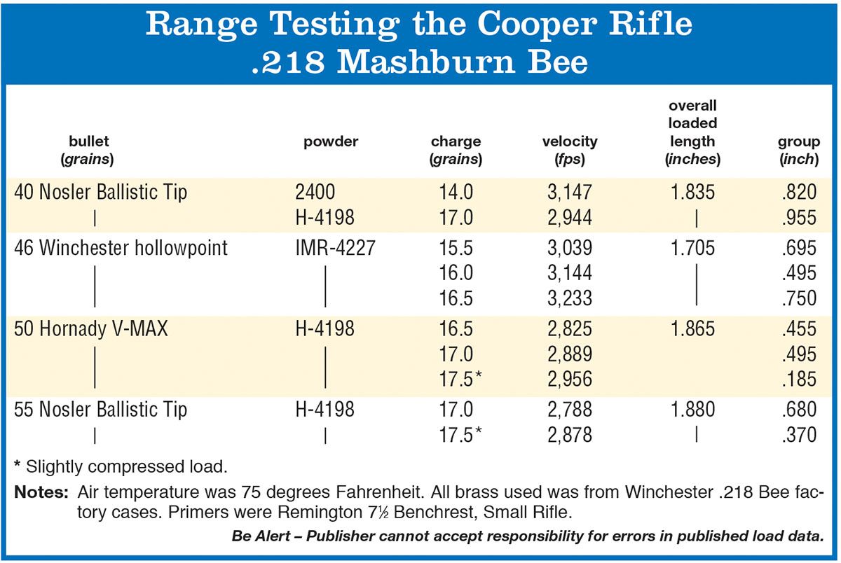 Looking at the table, the cartridge and the Cooper rifle did more than their part in this marriage. Alliant 2400 pushed a Nosler 40-grain Ballistic Tip over 3,147 fps with groups under an inch. For smaller, much lighter weight game, this just could be one of the best around for closer-range shooting. I’ve used the 218 Bee with a 40-grain bullet previously and, depending upon the powder, got velocities around 2,900 fps. So the 2400 load is an improvement.