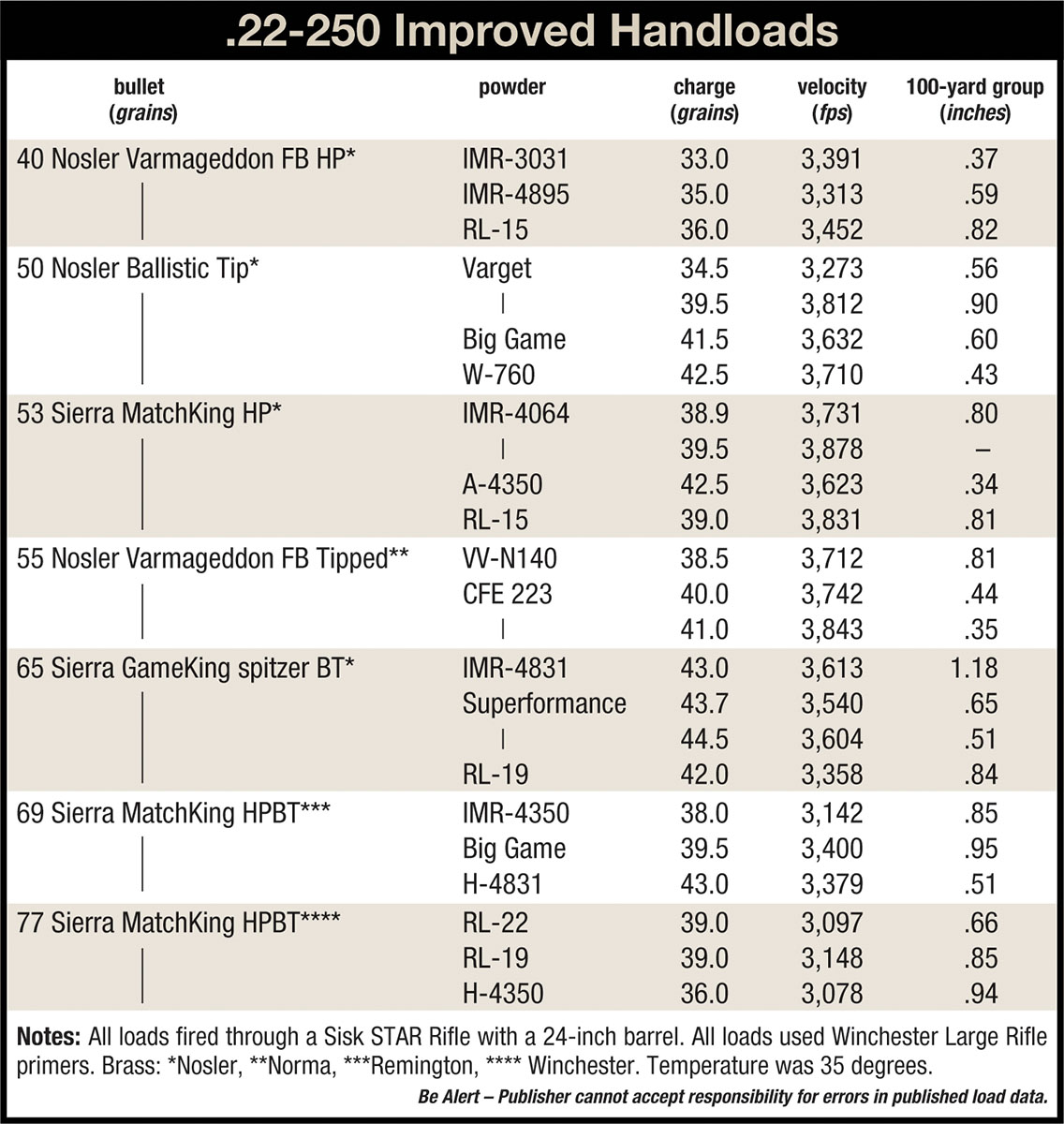A liability waiver isn’t required to step on the gas of the 22-250 Improved. The additional 2.0 to 4.0 grains of powder fired in the Sisk 22-250 Improved rifle resulted in safe pressures and a gain of about 100 fps over the standard 22-250. However, that velocity level is more than some bullets can withstand from a relatively fast 8-inch twist. Several Sierra 53-grain MatchKing bullets must have disintegrated in flight with a velocity approaching 3,900 fps, because they failed to reach the target at 100 yards. As the load table shows, accuracy was excellent with other bullets.