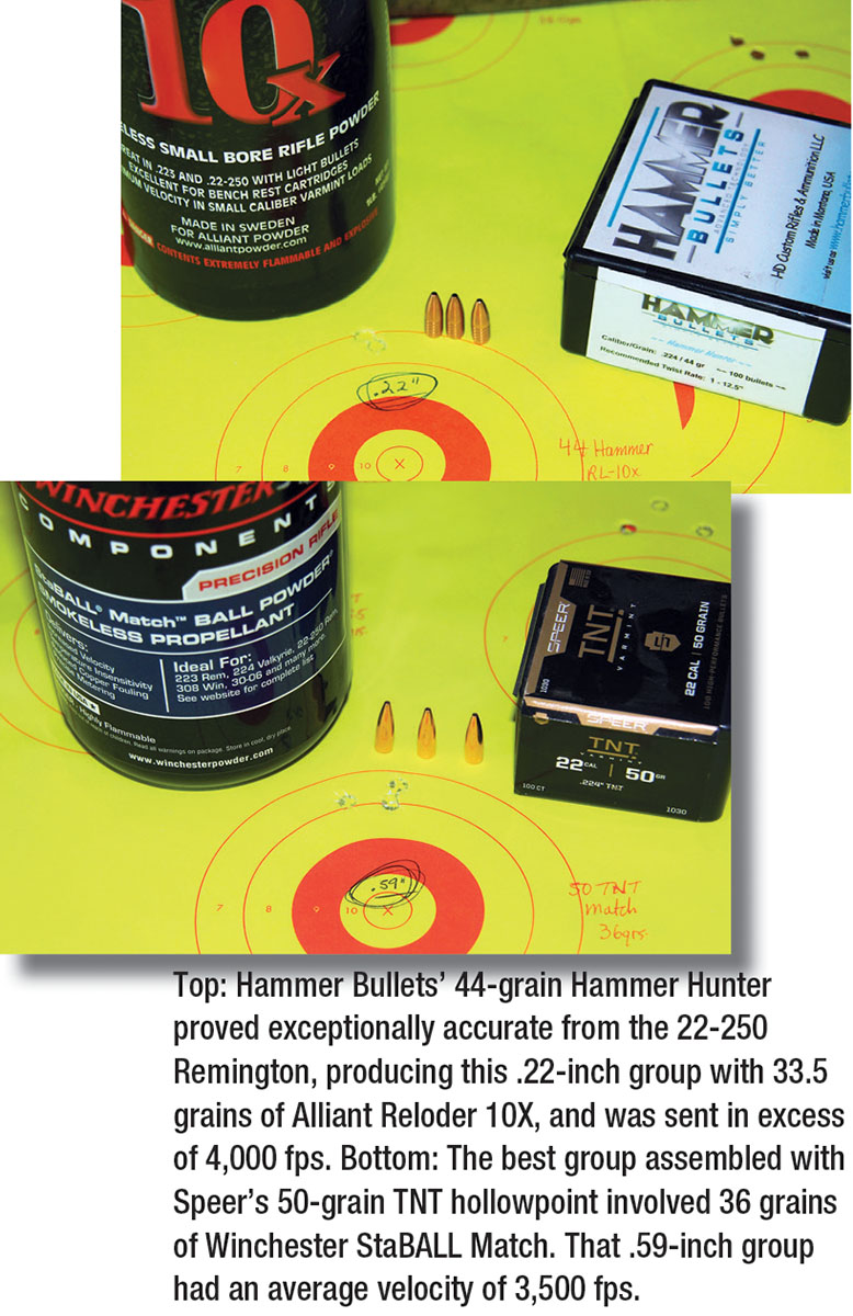 I certainly learned a lot during this project, discovering some new powder options for the old favorite varmint cartridge, as well as some bullets I am now anxious to test in my own 22-250 Remington. Those Hammer Hunter bullets printed one-hole groups at 4,000-plus fps are at the top of that list! I also confirmed Hodgdon’s CFE 223 still has it, in both the accuracy and velocity departments. Vihtavuori N150, Reloder 10X, and Accurate 4064 will certainly become part of my regular repertoire, while Winchester StaBALL Match, Reloder 15.5 TS, and Shooters World AR Plus obviously deserve further experimentation.
