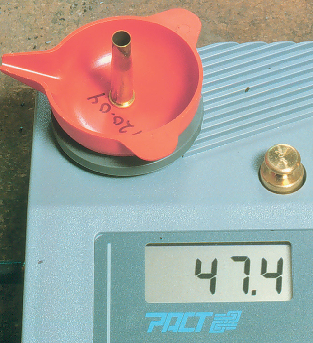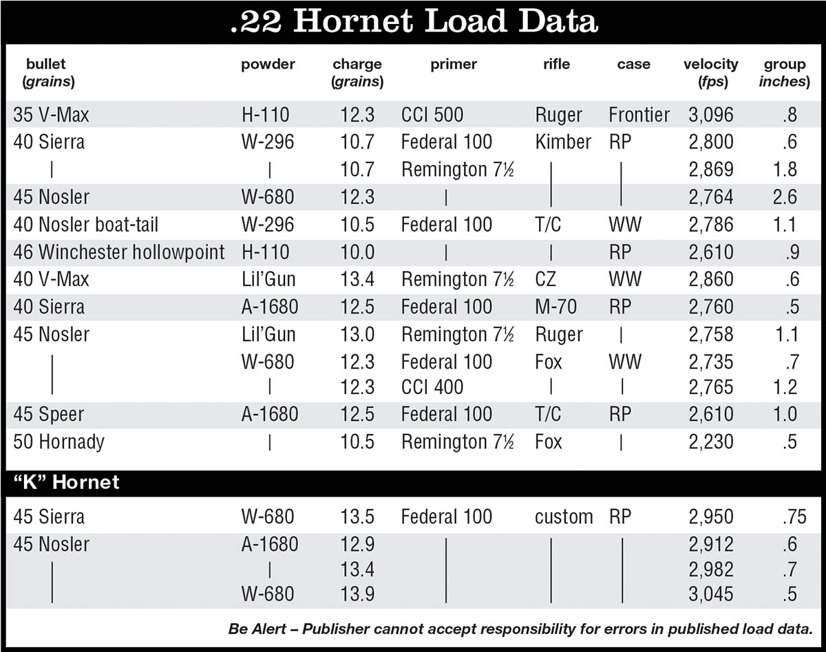 There is also a very interesting Hornet powder on the market. As it turns out, it may also be the best magnum pistol powder. This is Hodgdon Lil’Gun. It was designed for .410 shotshells and has quickly adapted itself to big revolvers and the little rifle. It is especially happy with 45-grain bullets, at times beating H-110 in the speed department, while reducing pressure. As I mentioned earlier, powder weight is critical in the little case. While in most rifles I usually worry in full-grain increments, or at worst .5 grain the Hornet will notice .10-grain changes. Using H-110 as an example, .10 grain can add 50 to 100 fps, at near maximum loads. So, do not be afraid to tweak your powder measure just a little in experiments, keeping in mind that few powder scales will reliably detect .10 grain.