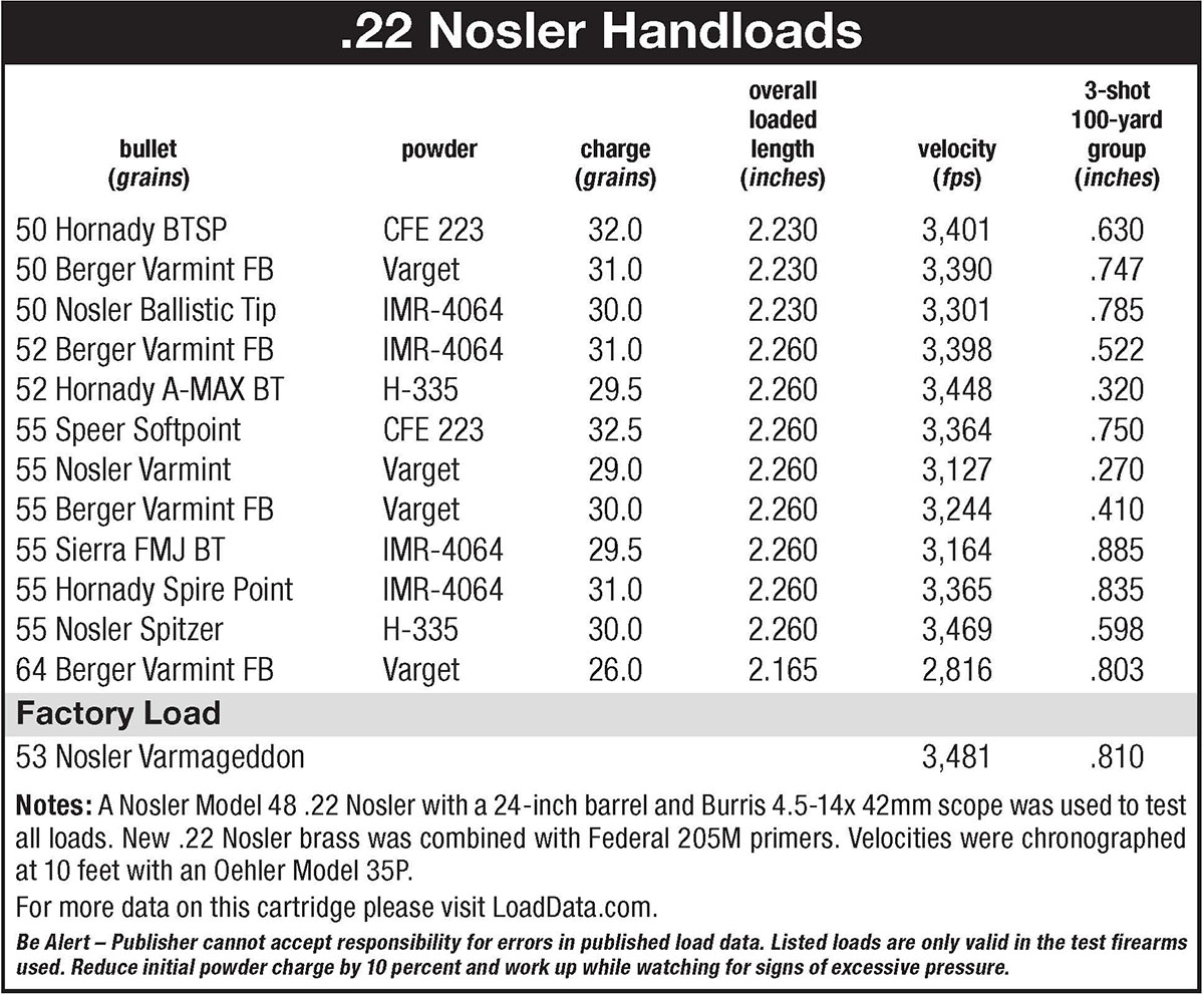 Aside from bullet selection, as noted in the table, looking for the right powder is paramount when developing accurate handloads. While there are many powders to deal with, getting them down to a reasonable number is the best way to zero in on a good load. Working with the .22 caliber for years, it was easy for me to pick out the powders I thought were suitable for the 22 Nosler. In the end, IMR-4064 just has to be one of the best – if not the very best – powder to use for a majority of .22-caliber cartridges. I’ve read and I quote, “it is the most versatile propellant in the IMR spectrum,” which includes the 223 Remington, 22-250 Remington and the 220 Swift, to name a few. With the 22 Nosler, I found IMR-4064 filled the case almost to the point of compression, which is a good thing as the groups proved. In burning rate, most reloaders place it somewhat just over halfway in the long list of powders on the market today.