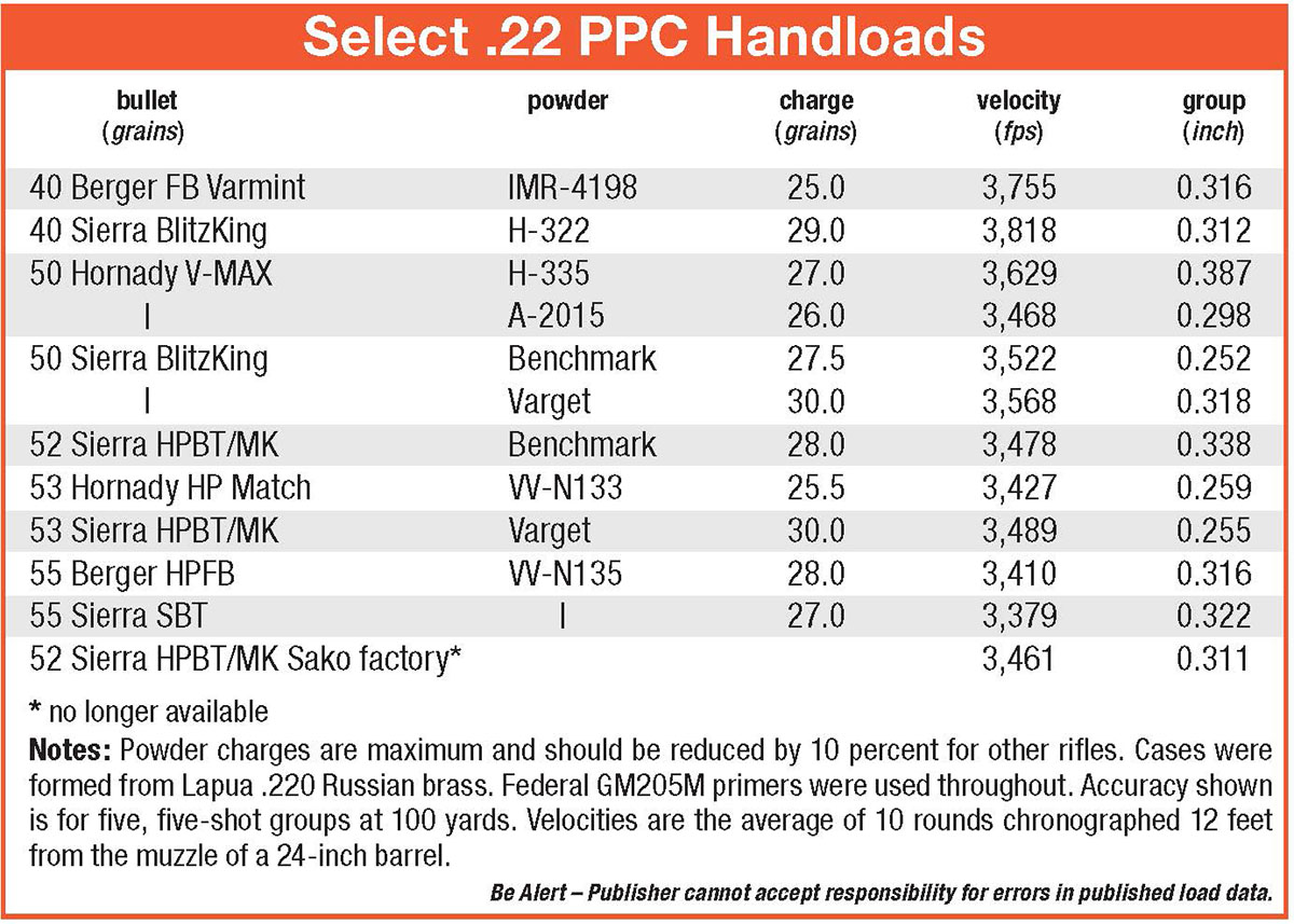 Any primer will work, but I lean toward the CCI BR-4 and the Federal GM205M. The one-in-14-inch rifling twist of my Sako rifle prefers bullets no heavier in weight than 55 grains, and it snuggles most of them inside half-MOA with pleasing regularity. I would like to name a favorite powder, but the rifle shoots all in the appropriate burn rate range quite well. In fact, it may be the least choosy varmint rifle I have ever owned. Other cartridges of its caliber are more popular, but few are as accurate as the 22 PPC.