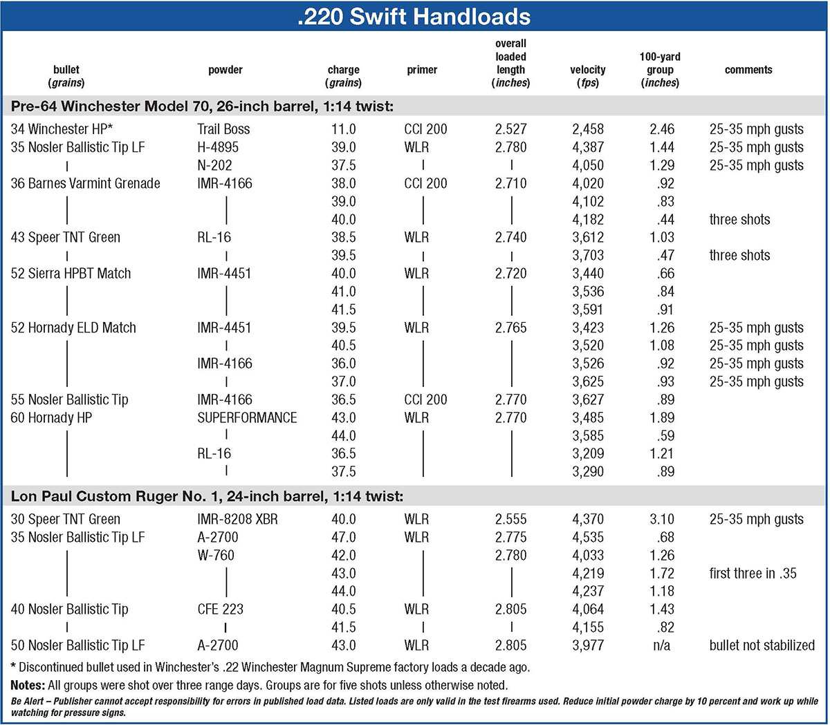 The accompanying loading data for the 220 Swift mostly features the new lead-free bullets and/or the latest batch of temperature-stabilized powders and those that reduce copper-fouling. Data for the new powders is very limited, because manufacturers focus their load development on the most popular rounds. The loads here give Swift owners some starting points for these new components. The new Reloder 16 powder was particularly impressive in delivering low extreme velocity spreads (usually less than 30 fps), but IMR-4166 was in the same ballpark.
