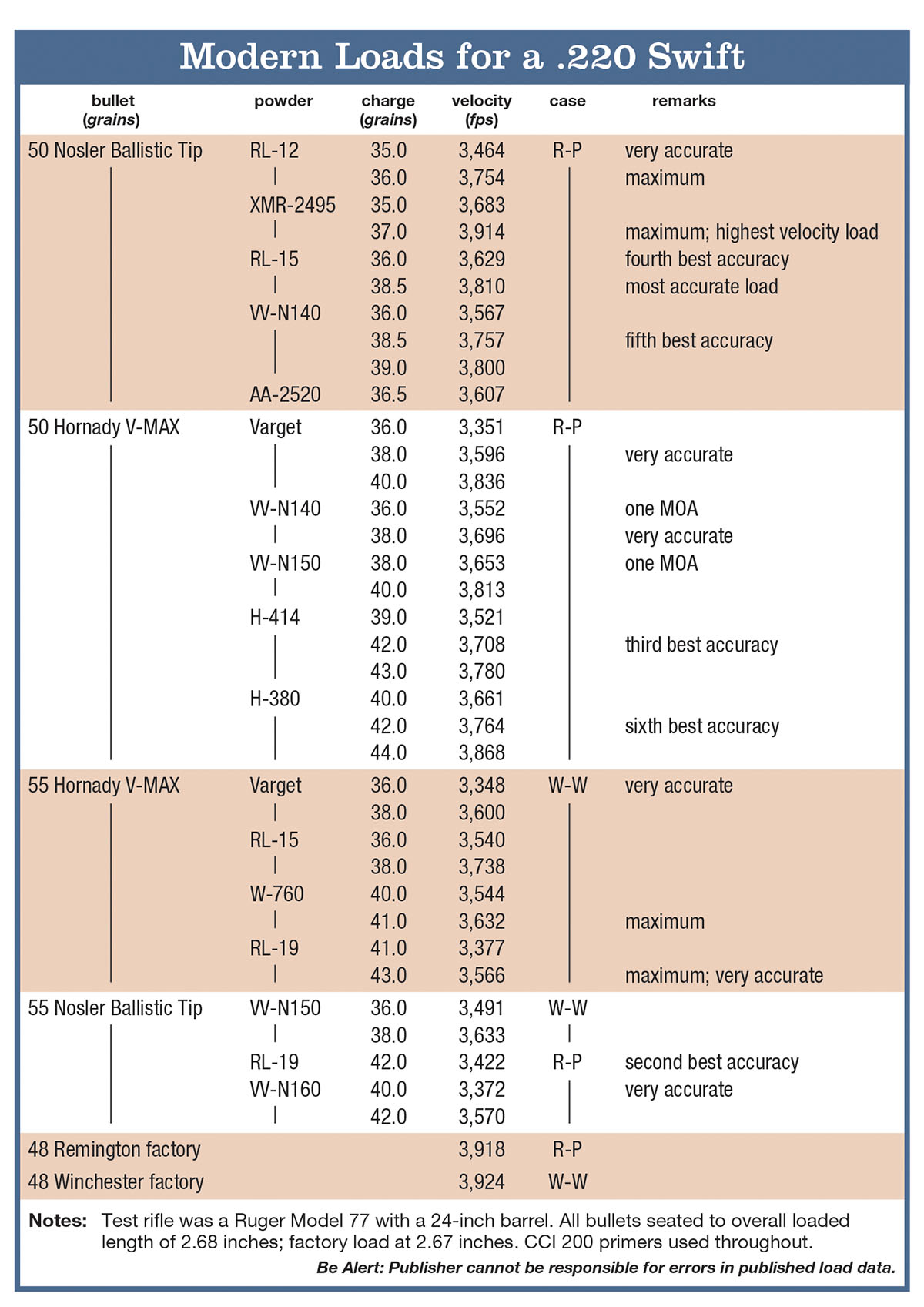 It’s been more than 20 years since I issued my last “Pet Loads” report on the .220 Swift. In that interval a considerable number of new powders and bullets have appeared while, at the same time, the Swift seems to have gained new followers. I also sense a change in emphasis away from the original barrel-straining, 4,000+ fps 48-grain loads to slightly heavier, more aerodynamically shaped bullets with flatter trajectories and better retained energies.