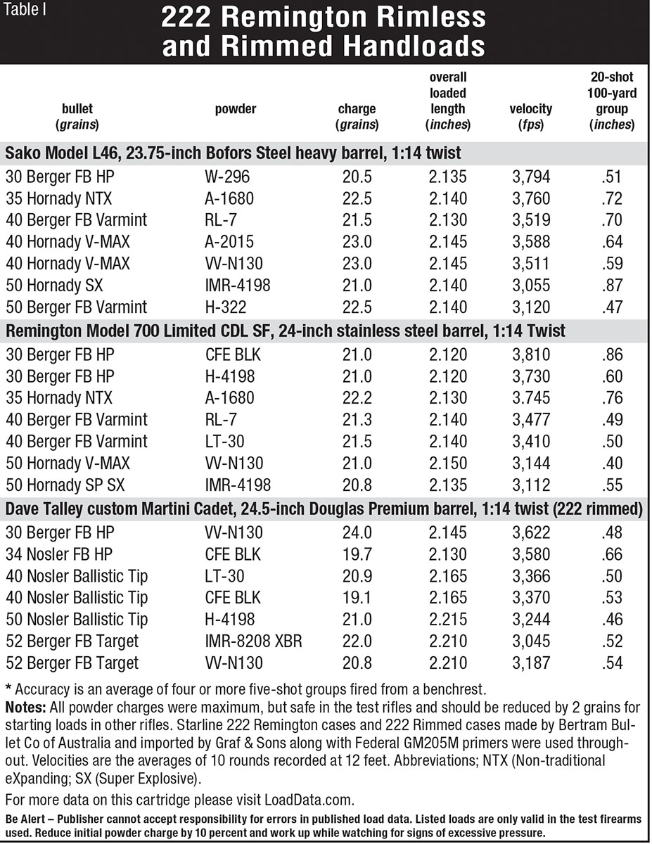 The 222 Remington has always been a great candidate for handloading. During its 35-year reign over benchrest competition, IMR-4198 was the most popular powder used with Bruce Hodgdon’s military-surplus BL-C in a distant second place. Its eventual replacement, BL-C(2), never became as popular. H-322 and Reloder 7 have long been excellent choices and as newer propellants go, Reloder 10X, Vihtavuori N130 and Ramshot X-Terminator are worthy of a try. I have long favored the Remington 7½ Bench Rest primer.