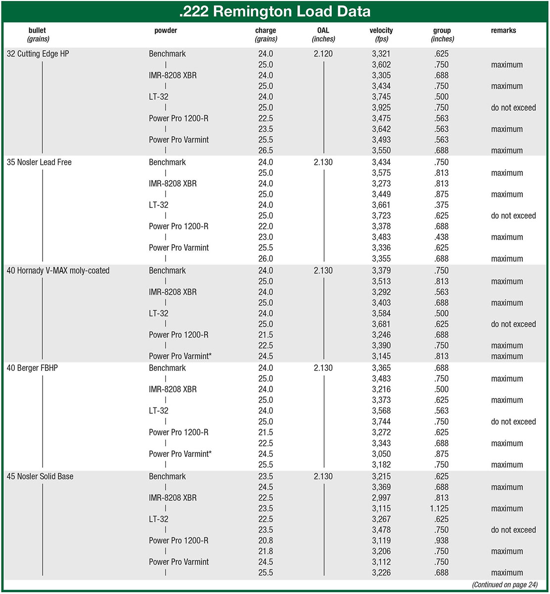 There are a full half-dozen powders that qualify as both new, or reasonably so, and suitable for use in the 222 Remington. Three are single-base, extruded powders: Hodgdon Benchmark, IMR-8208 XBR and Accurate LT-32. The other three are ball powders: Alliant Power Pro 1200-R, Power Pro Varmint and Hodgdon CFE 223.