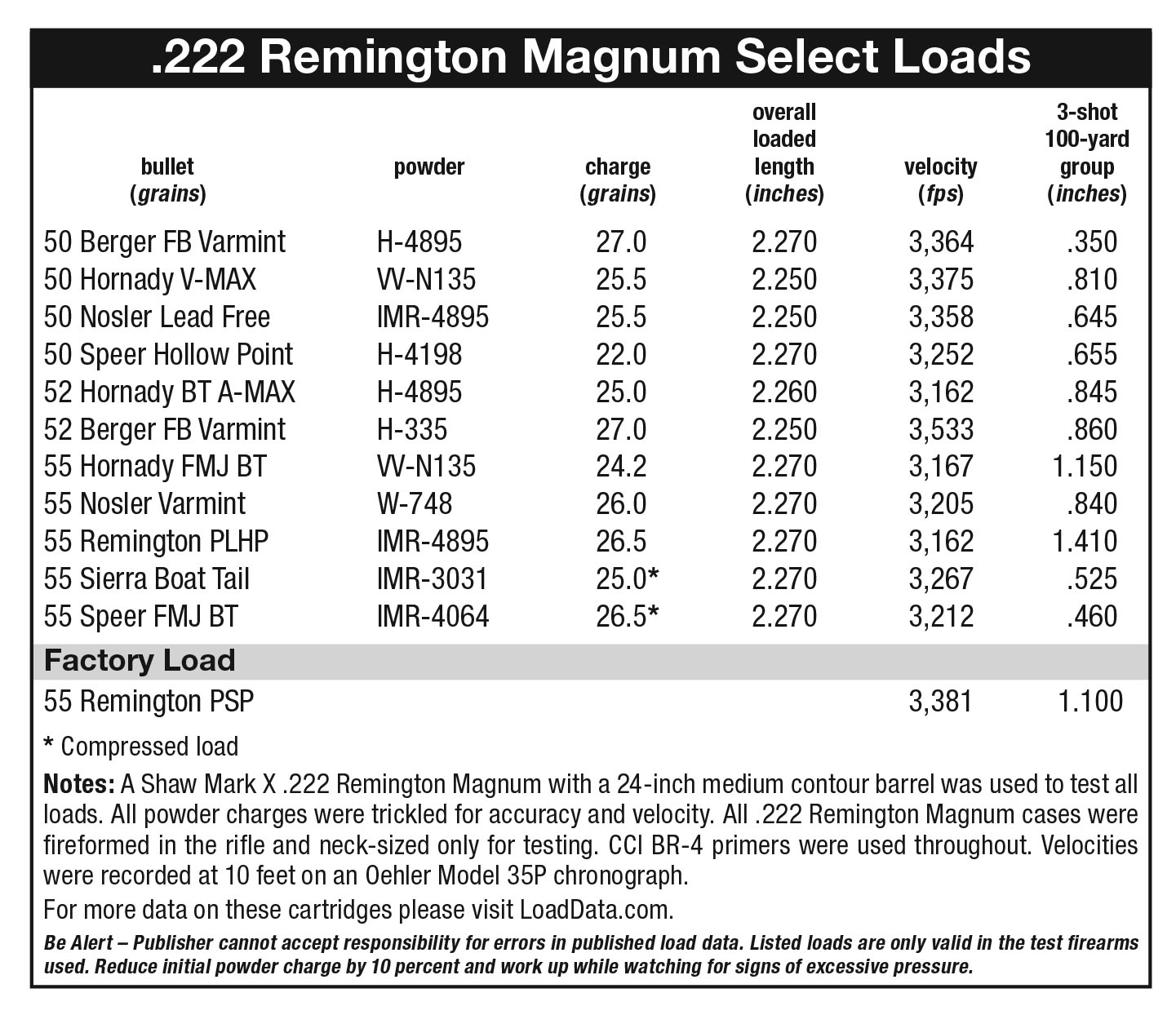 I had (the keyword here is HAD) a Remington Model 700 years back chambered for the 222 Remington Magnum, I did have a stash of 120 new brass cases ready and willing to be used. Before I did anything, I ran around 50-60 cases through the full-length-sizing die to square everything up, then loaded them with a charge of 23 grains of Vihtavuori N135 powder for an approximate velocity of 2,900 feet per second (fps). This accomplishes a number of things, including fireforming cases for serious loading with neck sizing only later and allows me to zero-in the rifle, saving time while keeping the barrel at reasonable temperatures during testing. Small rifle benchrest primers are used for consistency and accuracy.