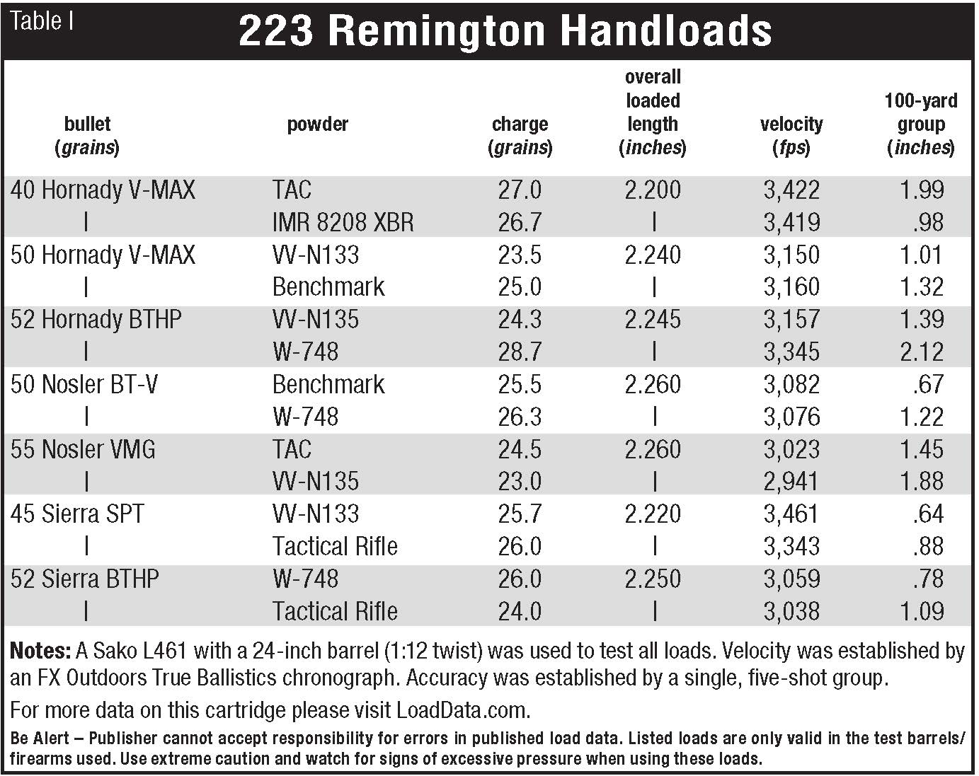 On the handloading side, I tested several different 40- to 55-grain projectiles. The components used for testing were twice-fired Laupa 223 Remington brass, and the primers used were CCI Small Rifle BR4. The top four results I got in my testing were with the 40-grain Hornady V-MAX and 26.7 grains of IMR-8208 XBR powder. A five-shot group was shot grouping .986-inch with an average velocity of 3,419 fps, a 19 standard deviation (SD), a 52 extreme spread (ES) and an average G1 BC .197 measured data using an FX Outdoors True Ballistics Chronograph.
