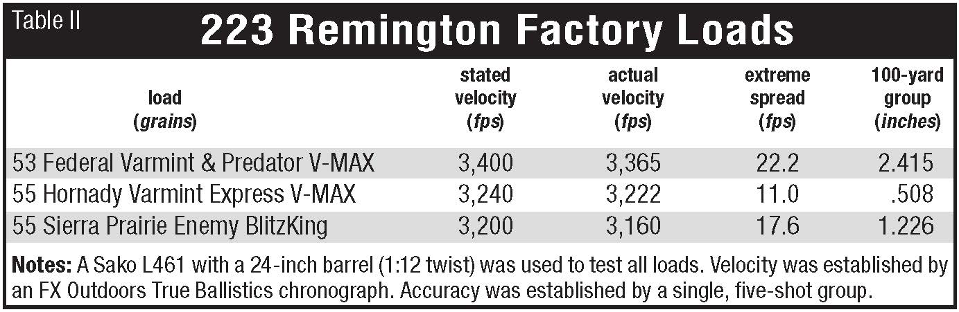 The best result in the Sako was the Hornady Varmint Express 55-grain V-MAX shooting a five-shot group of .508 inches at 100 yards. I was disappointed with how the other two factory offerings shot. The Sierra Prairie Enemy 55-grain Blitzking Varmint & Predator’s best five-shot group was 1.226 inches. The other three groups were measured around 2 inches. The Federal Varmint & Predator, loaded with Hornady 53-grain V-MAX, did not stabilize in the Sako 1:12 twist, which I found interesting. I shot two groups with that ammunition; the best group was the 2.415-inch group.