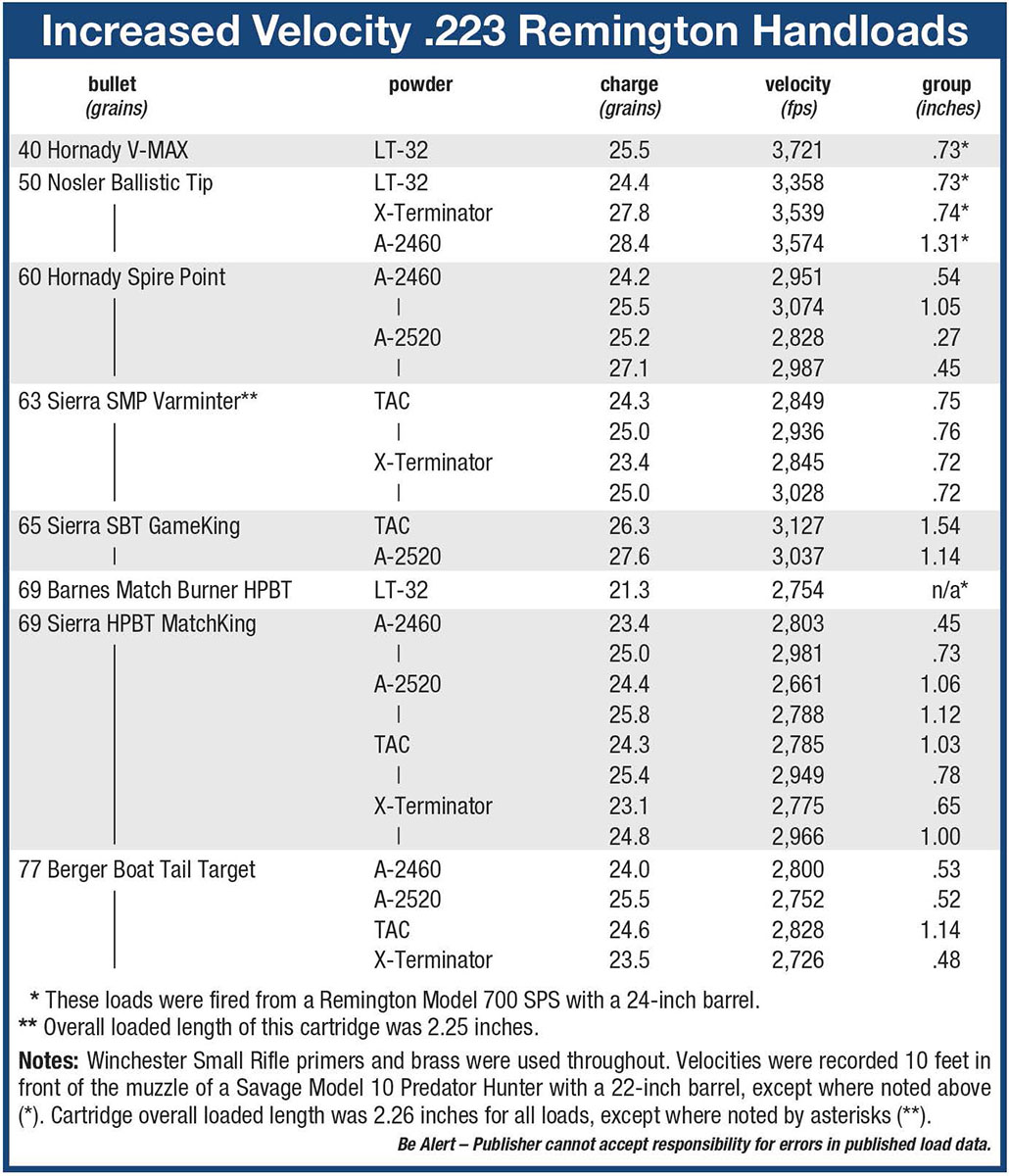 Some of the loads in the table include Western Powders’ top powder weights for standard pressure 223 Remington loads, followed by the heaviest powder weights of the increased pressure loads. Both powder weights for A-2460, A-2520, TAC and X-Terminator were fired in a Savage Model 10 Predator Hunter with a 22-inch barrel with a 1-9 twist. The Savage has shot well in the past with bullets weighing up to 80 grains, and it kept up its good shooting with both powder weights paired with Hornady 60-grain Spire Point, Sierra 63-grain SMP Varminter and Sierra 69-grain HPBT MatchKing bullets.