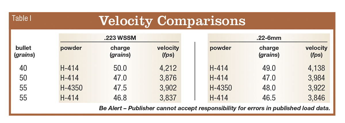 Speaking of efficiency – one of the short and super short magnums’ claims to fame is their short and wide powder column promotes an especially efficient and consistent powder burn. I’ll go along with that, somewhat. Looking over my chronograph records, I noticed the .223 magnum and the .22-6mm cartridges shoot nearly identical amounts of powder and return approximately the same bullet speed. However, the .22-6mm has a comparatively long and thin powder column. Yet the energy delivered to the energy supplied by the .22-6mm is exactly the same as the .223 WSM. The powder weights and resulting speeds of the same kinds of bullets for the two cartridges, both shot through 24-inch barrels, are shown in Table I.