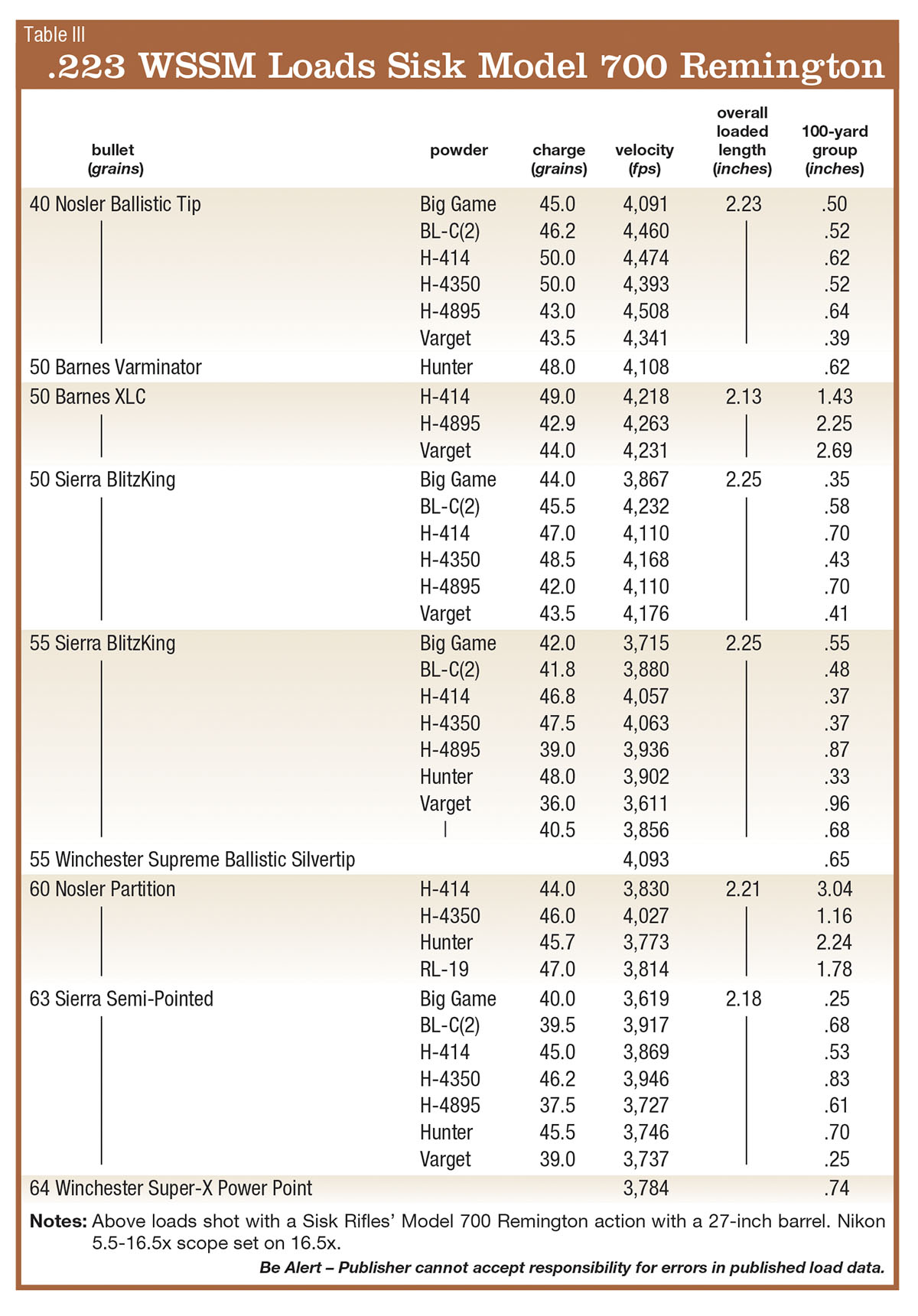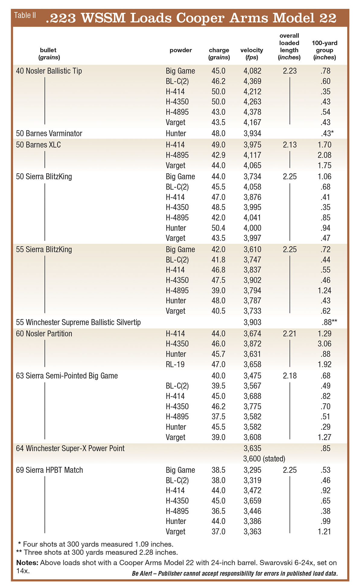 The .223 WSSM was very accurate. The Cooper Model 22 rifle wore a Swarovski 6-24x scope and the Sisk rifle a Nikon 5.5-16.5x Titanium scope, both in Talley bases and rings. Anytime I con-sistently shoot groups under .5 inch, I know the proper gear has more than compensated for my wiggles and wobbles. Only the Barnes X-Bullets and Nosler Partition bullets grouped over one inch in the Cooper and Sisk rifles. Only four loads with the other bullets grouped over one inch in the Cooper rifle. None of the other bullets grouped over .96 inch in the Sisk rifle.