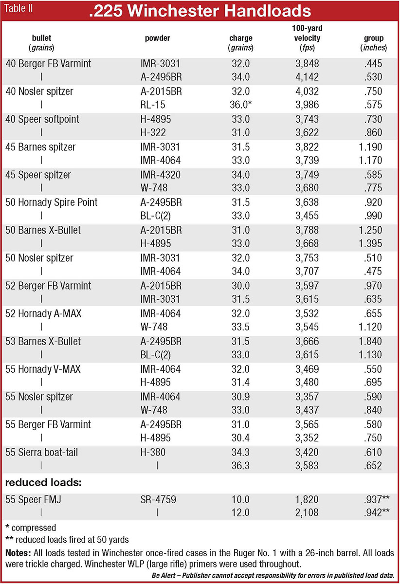 Winchester still shows 225 un-primed brass (as of 2015) on its list of available components, and a single 55-grain Pointed Soft Point factory load is listed at over 3,500 fps. In my rifle, velocity was 3,404 fps with a 1.23-inch group. Since the 225 Winchester uses .224-inch bullets, many bullets, primers and powders are available.