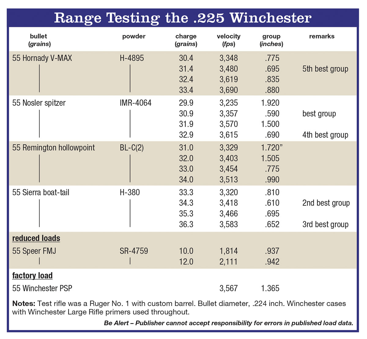 Today’s loading manuals show what looks like a new ball game for the .225 Winchester, especially when it comes to modern powders. A check with friends, current reference material and back articles by fellow colleagues show the trend in .225 powders can be narrowed to H-4895, IMR-4064, BL-C(2) and H-380. Case capacity of the .225 Win-chester considered – at 42.0 grains water – is below the .22-250 Rem-ington at 44.9 and the .220 Swift at 51.1 grains water. In short then, the often maligned .225 Winchester seems to dote on slightly midrange or slower propellants.
