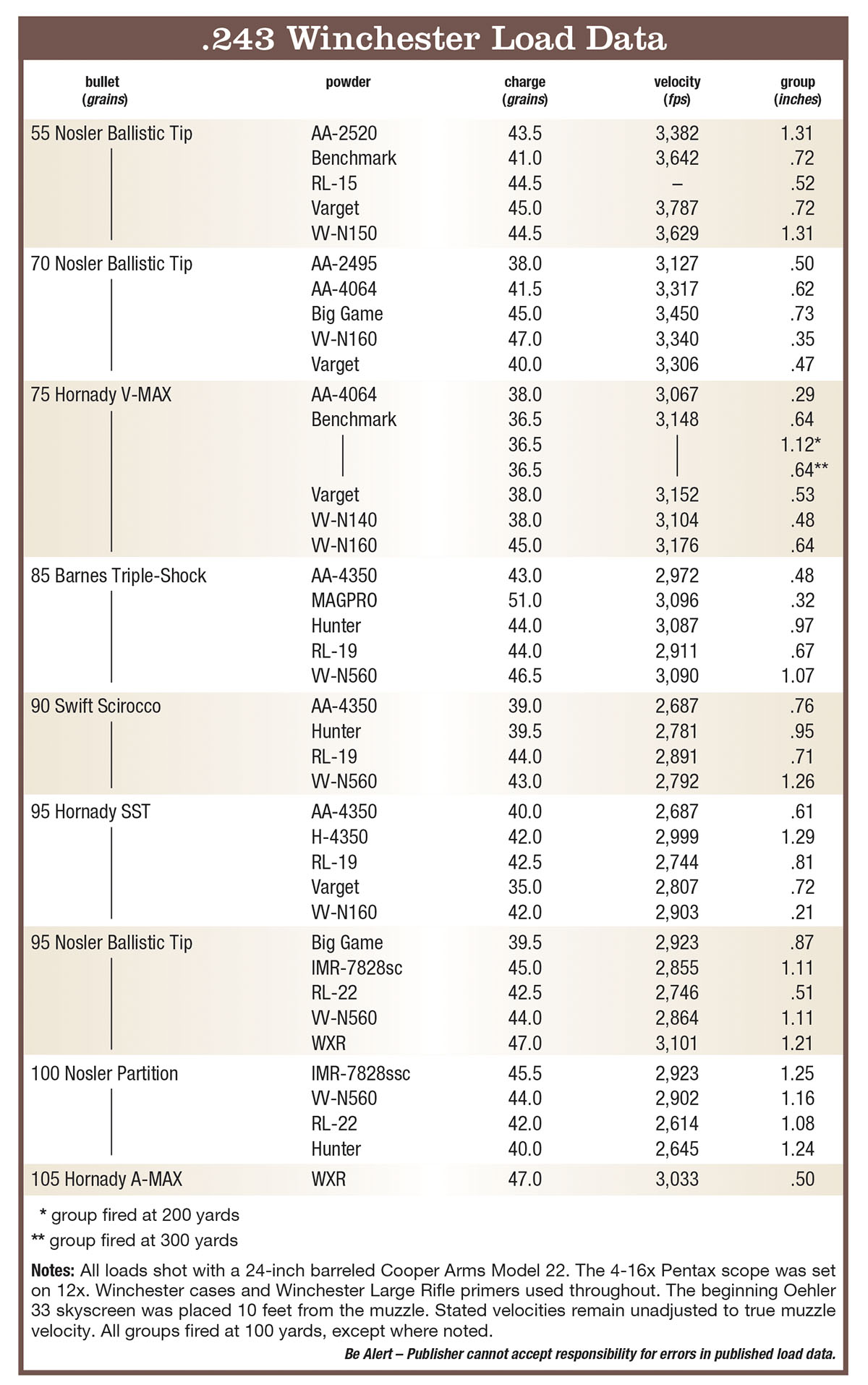 fps, it shoots as flat as the .22-250 Remington with 55-grain bullets. The .243’s recoil is not objectionable, but it’s enough to cause the loss of your sight picture and requires a spotter to tell you where the bullets hit.