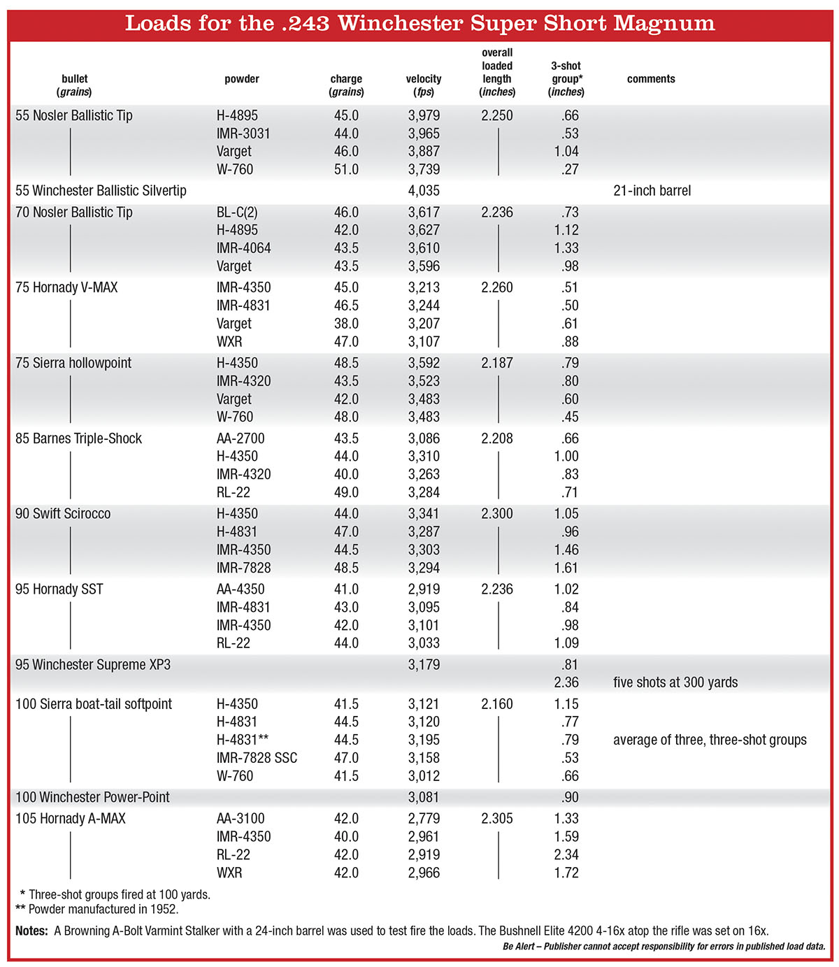 A fellow from Winchester Ammunition said his Browning A-Bolt chambered in .223 WSSM has had 2,200 rounds fired through it and still groups five shots inside an inch at 100 yards. I like the chrome- lined bore because it’s easy to clean. After firing 150 rounds of .243 WSSM cartridges one day through the Browning A-Bolt Var-mint Stalker used to shoot the loads listed in the load table, I squirted Birchwood Casey Bore Scrubber foaming gel in the bore and left it overnight. The next morning the bore got a good scrubbing with a brush, a few patches to wipe out the gunk, and it was clean. Copper fouling was minimal.