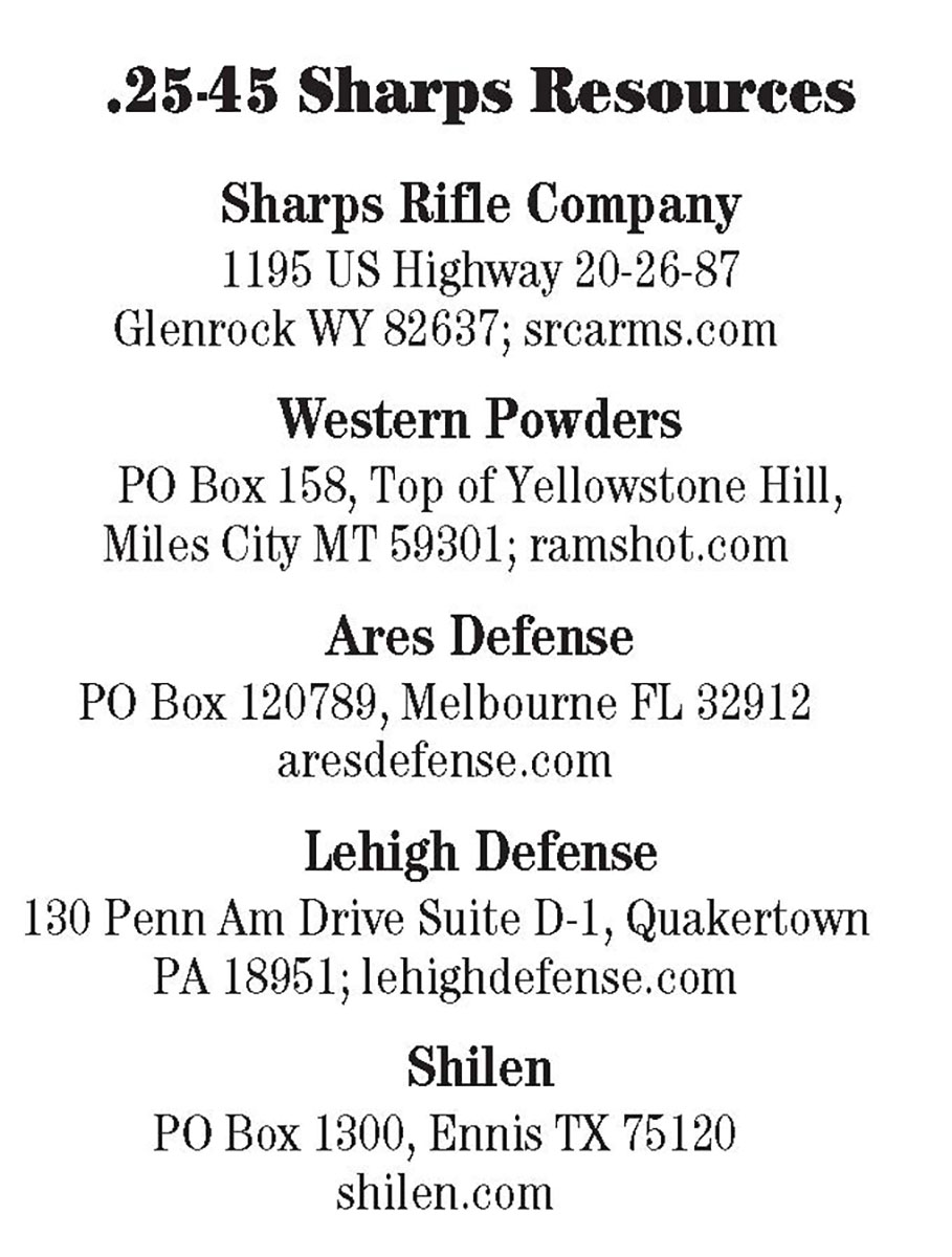 Having used a 223 Remington for everything from prairie dogs to warthogs, I’m convinced that with proper bullets it would have worked just as well in Africa as the 25-45 Sharps. So, again, what’s the point? The 25-45 Sharps is an easy conversion and fairly mirrors the 250 Savage. It allows a hunter one rifle suitable for all varmints and game up to the size of wild hogs and deer. Recoil is minimal, and though factory ammunition is limited, cases are easily made from 223 Remington brass.