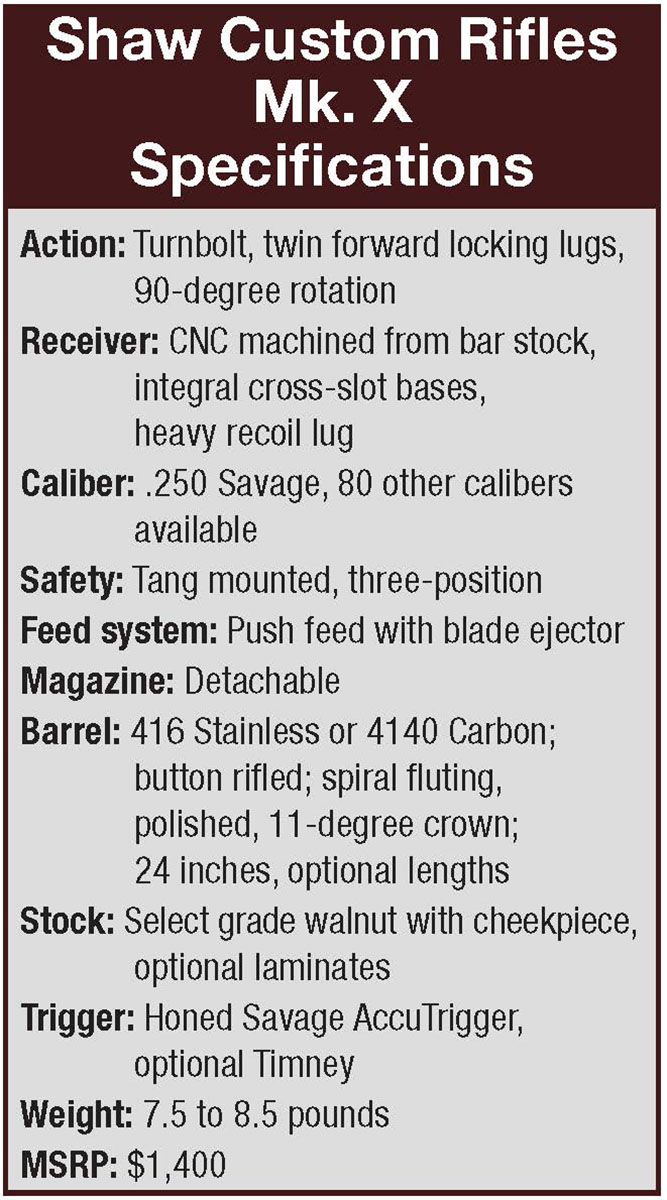 I like the new Shaw Mk. X Custom rifle. With an almost unending list of cartridge choices, fine workmanship and accuracy, this rifle is surely going to be one of my favorites. The company has been in business for a long time and knows what a premium rifle is. For more information, visit shawcustombarrels.com.