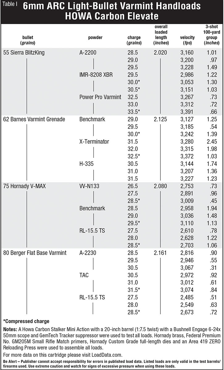 Carbon Elevate loads were assembled using lightweight varmint bullets for moderate-range ground squirrels or coyote calling. These included Sierra’s 55-grain BlitzKing (.225 G1 BC at 2,950 fps), Barnes 62-grain Varmint Grenade (.199 G1 BC), Hornady’s 75-grain V-MAX (.330 G1 BC) and Berger’s 80-grain Flat Base Varmint (.300 G1 BC). The Sierra is simply the lightest 6mm/.243-caliber bullet available, so it seemed important to see how the longer jump into the lands and fast rifling twist would affect accuracy. The Varmint Grenade was a natural choice, as the lead-free composition makes it relatively long for weight and is legal in places like California with lead-bullet bans. Hornady’s 75-grain poly-tipped/boattail V-MAX was a shoo-in, and Berger’s 80-grain Flat Base Varmint offers some of the most consistent accuracy in my experience and an impressive BC.