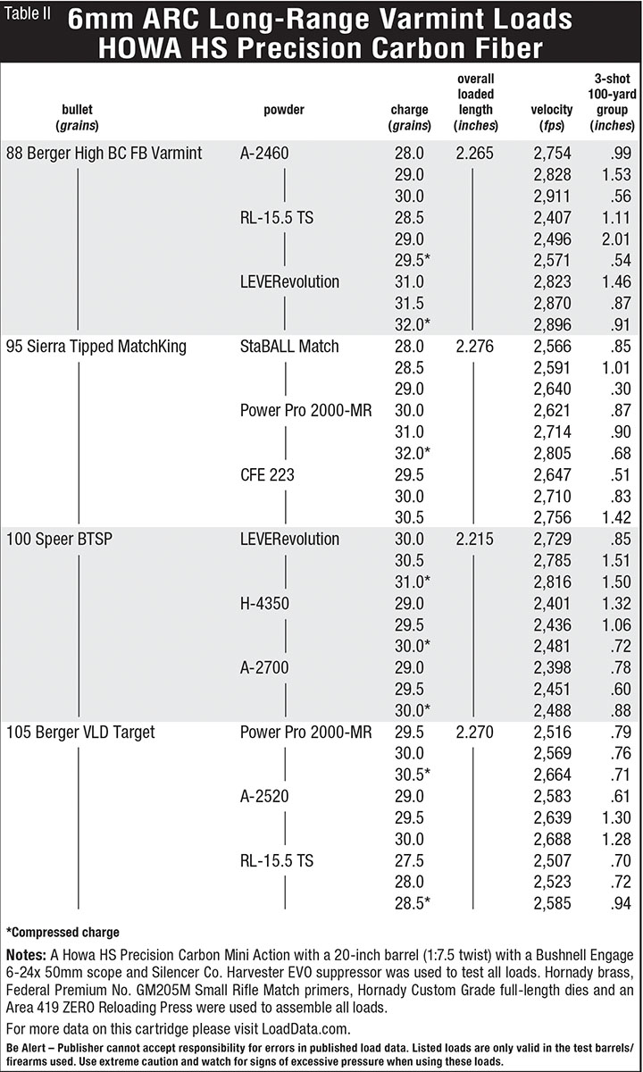 I have a great deal of experience with the 6mm ARC at this point. This allowed me to make some pretty solid choices regarding compatible powders that provide excellent combinations of velocity and accuracy, particularly with heavier bullets. I also added a few newer powder options that show promise in this round.