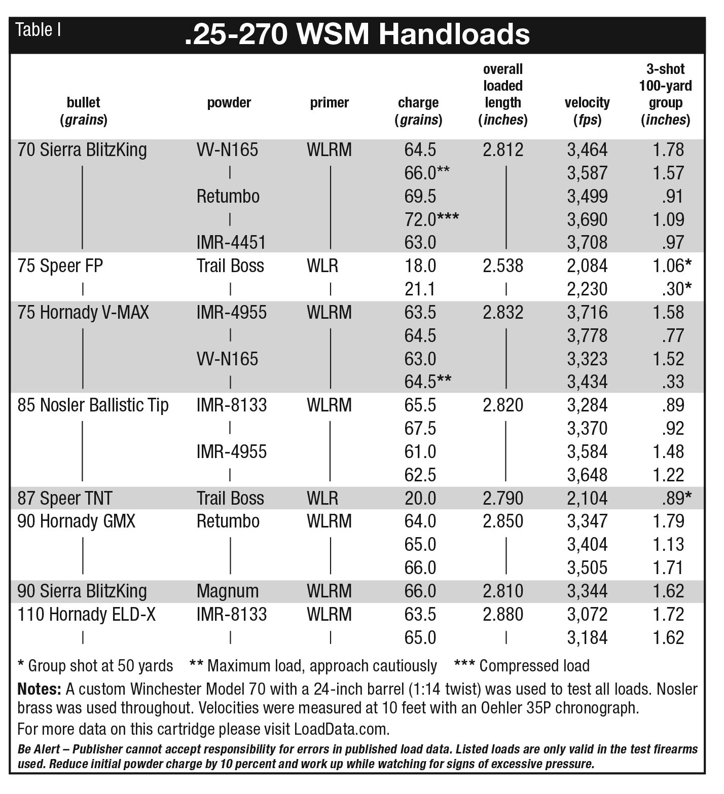 I also wanted to use a range of bullets, from the lightweight slugs to the heavier models with higher ballistic coefficients. With that in mind, I selected eight bullets for testing, ranging from 70 to 110 grains. I also used mostly newer powders in the slower end of the spectrum with IMR-4451 being the fastest powder tested and IMR-8133 being the slowest for full-power loads. I always include Trail Boss or other reduced-velocity loads in my testing as light, easier-on-the-barrel loads for volume ground squirrel shooting or plinking. Two of the bullets selected were chosen with this in mind, the Speer 75-grain flatpoint designed for the 25-20 and the Speer 87-grain TNT, which is very frangible and might come apart in flight if run at high velocities attainable in the 25-270 WSM. Both were used to shoot a few spring ground squirrels in playing with the rifle, and these bullets at the modest 2,000 to 2,200 fps velocities pieced out the squirrels like 22-caliber slugs at much higher speeds.