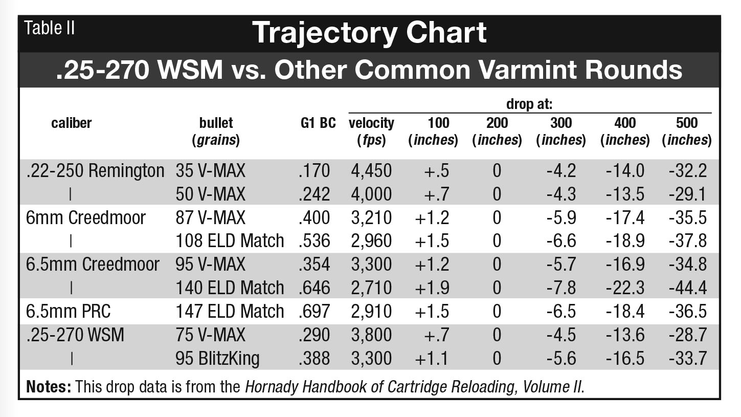 How do fast bullets out of a 25-270 WSM, featuring relatively low-BC bullets, compared to uber-popular rounds like the 6.5 Creedmoor on paper. It’s an eye opener. With an identical sight-in point of 200 yards, the difference in drop at 500 yards is 6 to 16 inches, depending on which loads are used (see table).