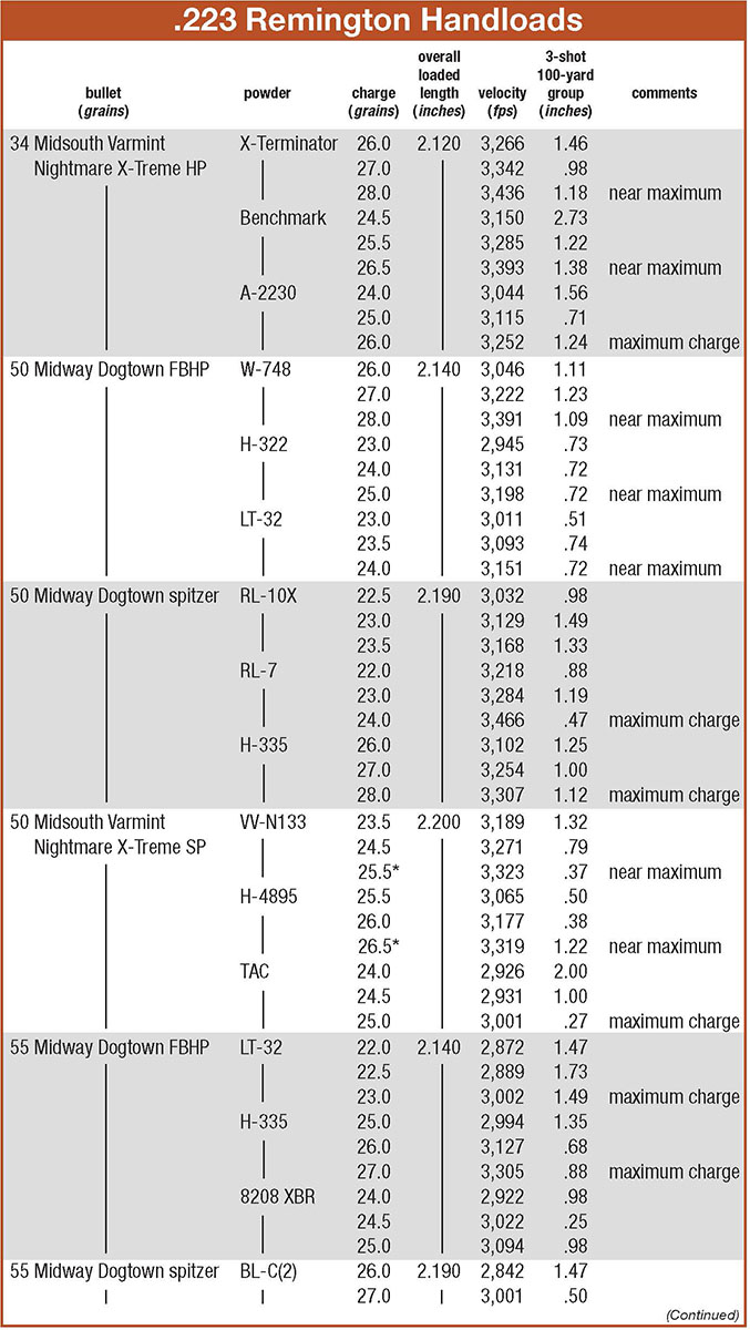 I have several hundred prepped and primed, once-fired Lake City brass on tap (sorted freebie pickups), cases that have traditionally proven to be reliable. They hold 30 grains of water on average; comparable with Hornady, Remington, Federal and Winchester brass. Bullets consisted of four Midway Dogtown selections in 50- and 55-grain hollowpoints and softpoints, five Midsouth Shooters Supply Varmint Nightmare X-Treme and Varmint Nightmare offerings, including 34-grain hollowpoints, 50- and 55-grain HPs and softpoints, plus Rocky Mountain Reloading’s new 69-grain BTHP 3-Gun Hunter. The latter successfully mimics Sierra MatchKing ballistic characteristics, but with an explosive tip and internal crimp that checks expansion. A sufficient supply of CCI 400 primers was on hand.