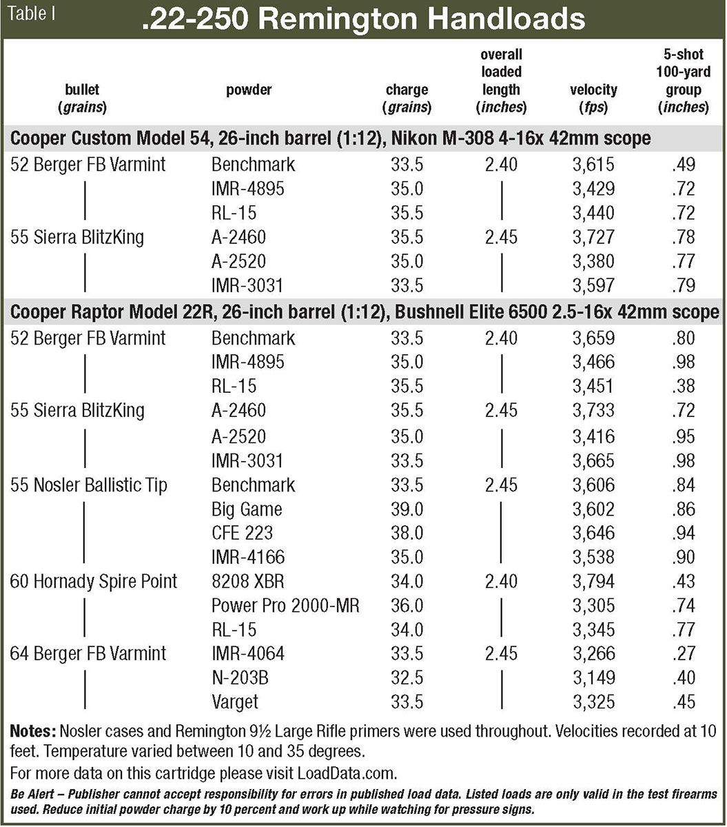 Nearly every 22-250 load shot through the Raptor grouped three bullets in .5 inch at 100 yards. Several handloads did the same with five shots. Berger 64-grain FB Varmint bullets shot especially well with three powders. Three of the Berger bullets together with Varget powder shot 1.34- and 1.10-inch groups at 300 yards.