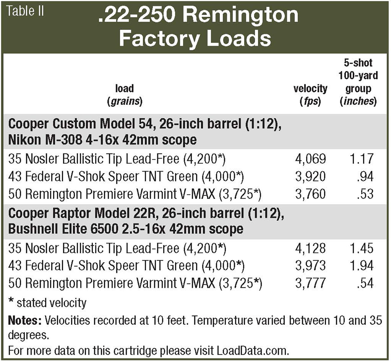 He considers the 22-250 the gold standard of varmint cartridges because of its great accuracy and high velocity. To authenticate his claim, I thumbed through my records for my Cooper single-shot Model 22 Phoenix 22-250 I’ve been shooting for years on end. The average size of 73 five-shot groups was .62 inch.