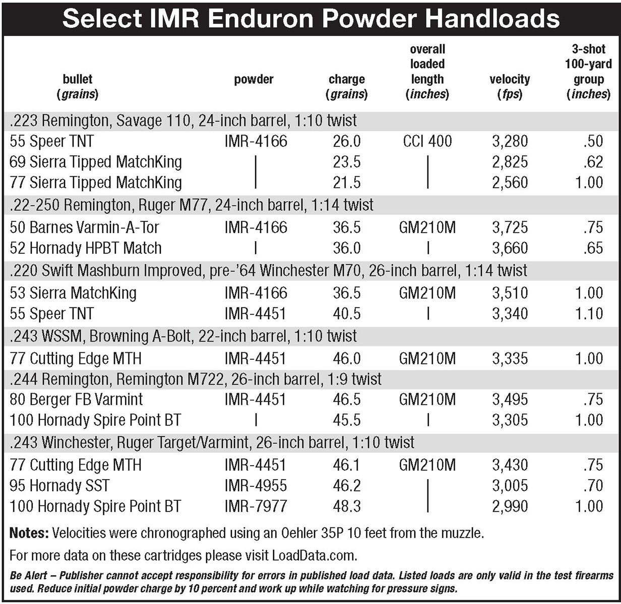 Cartridges best suited for varmints and predators are usually on the smaller side, starting with the 17s and running up through the 6.5mms. Because the fastest-burning powder in this line is IMR-4166 – with a burn rate similar to IMR-4064 – those cases on the smaller side won’t work well with this line. The 17 and 22 Hornet, the 221 Fireball and cartridges of similar capacity require faster-burning powders, but the 223 Remington, 22-250 Remington and 243 Winchester – all very popular choices for varmint and predator work – will run very well on one or more of the Enduron options.