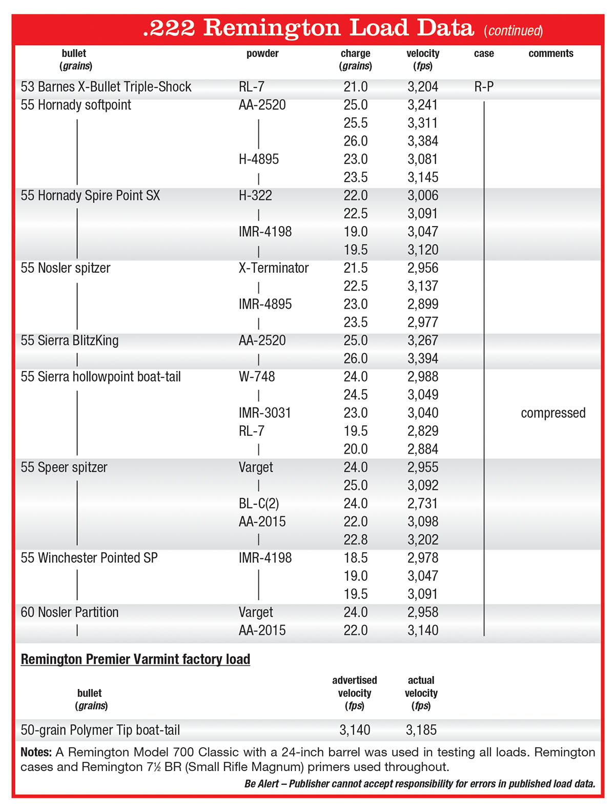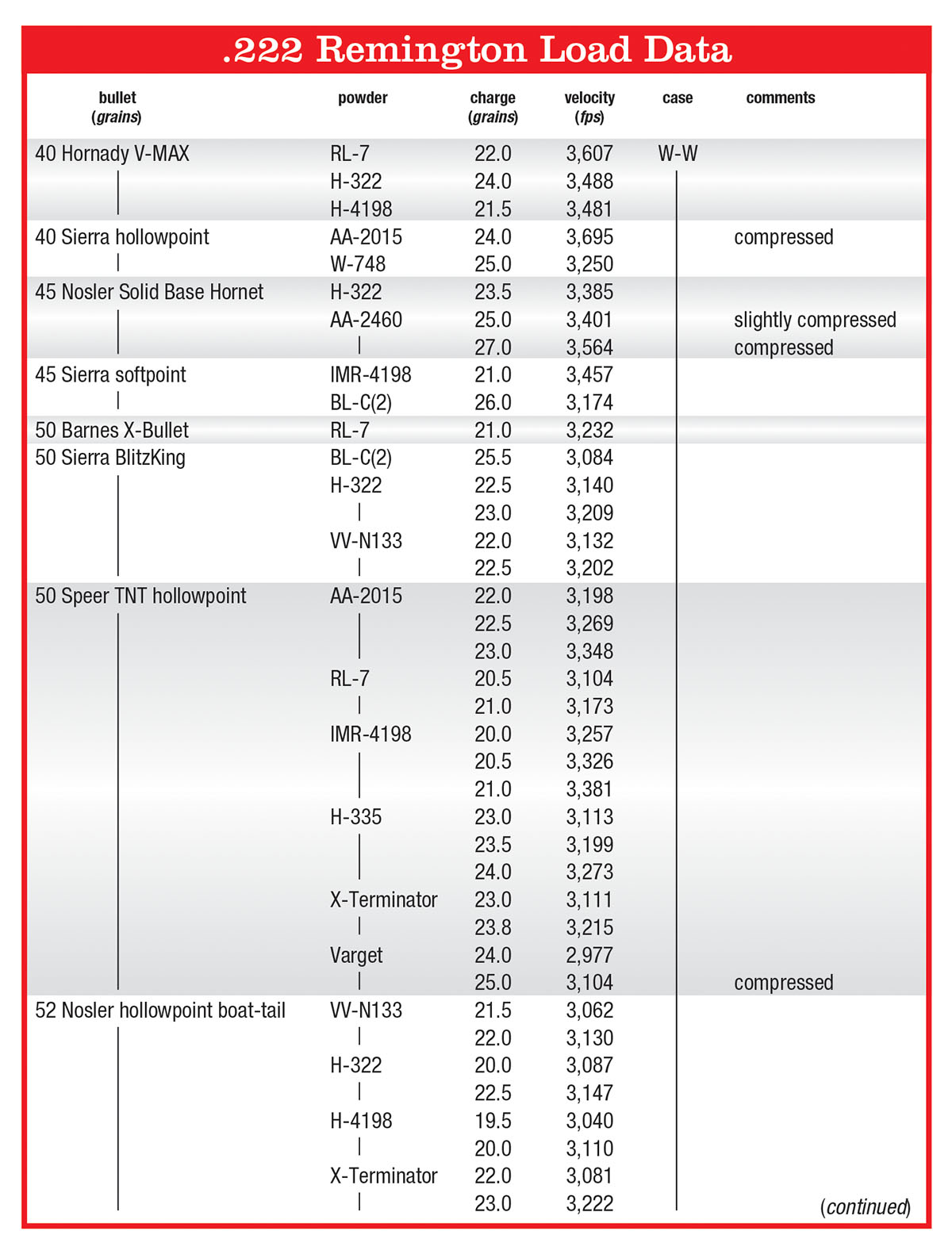 Today industry operating pressure for the .222 Remington is established at 46,000 CUP. Certainly most bolt-action rifles will allow the cartridge to be loaded to greater pressures, similar to the .223 Remington or .222 Remington Magnum, which run 52,000 and 50,000 CUP, respectively. To me this seems to take away some of the little round’s virtues, such as low muzzle blast and long barrel life, and as previously stated, some of the most accurate loads were not top-velocity numbers.