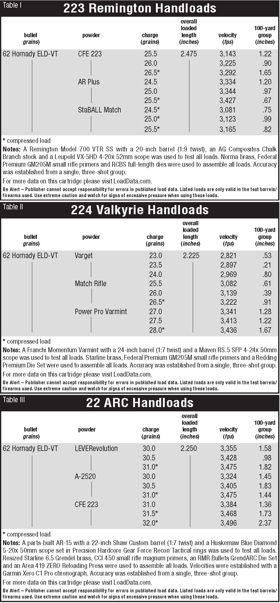 Cartridges used to wring out the 62-grain Hornady ELD-VT bullet include: (1) 223 Remington, (2) 224 Valkyrie, (3) 22 ARC, (4) 220 Swift, and (5) 22 Creedmoor.