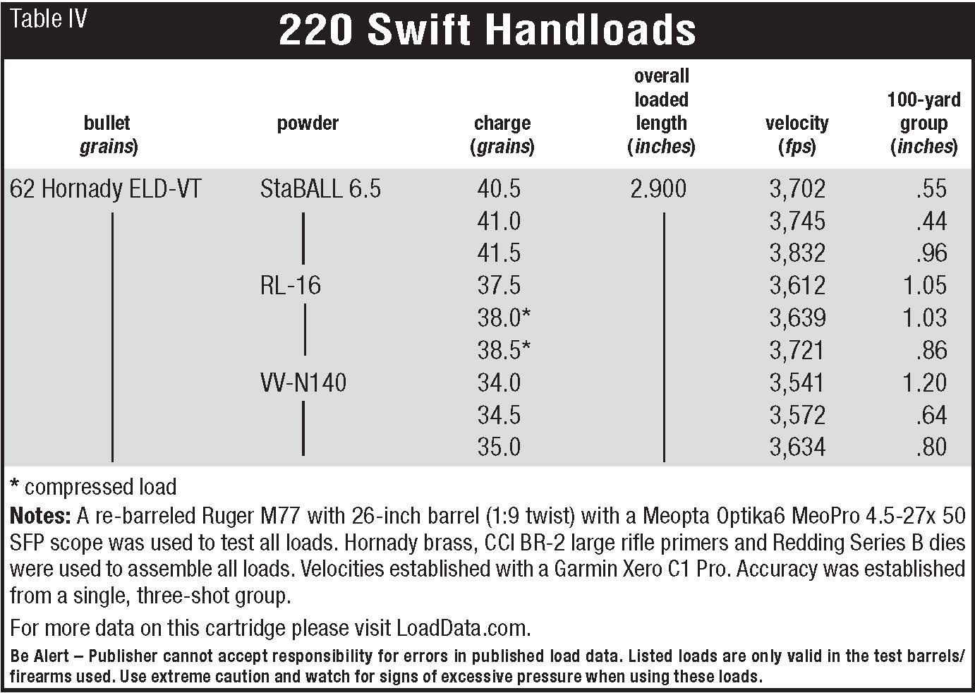 My fast-twist Ruger M77 220 Swift came about after burning out the original tube and deciding that if any varmint cartridge warranted heavier bullets it was the Swift. Like the 223 Rem VTR and its identical 1:9 rifling twist, this rifle has shown an ability for greater accuracy with target bullets as heavy as 69 to 73 grains, though at least one powder did well in this series. The replacement barrel is quite heavy and measures 26 inches long. The Meopta Optika6 4.5-27x 50m SFP scope is another of my varmint favorites. New Hornady brass, CCI BR-2 primers and a Redding Series B die set were used to assemble all loads.