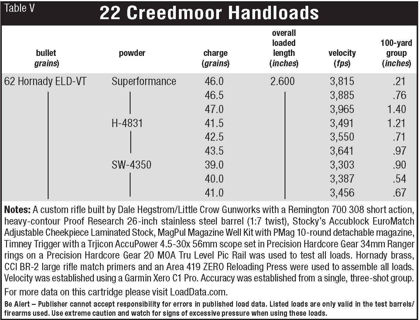 My 22 Creedmoor provides the ultimate .224-caliber performance, not only sending high-BC bullets at impressive velocities but usually proving impressively accurate. I believe the 62-grain ELD-VT was a bit light for this cartridge, posing as they say, too much of a good thing. The heavy Proof Research barrel is 26 inches long and includes a 1:7 twist. The action is slim bedded in a Stocky’s Accublock EuroMatch Adjustable Cheekpiece Laminated Stock with MagPul Magazine Well Kit holding a 10-round PMag. It includes a fine Timney Trigger. A Trijicon AccuPower 4.5-30x 56mm scope is set atop Precision Hardcore Gear 34mm Ranger rings and a 20 MOA Tru-Level Picatinny Rail. Hornady brass, CCI BR-2 primers and a Hornady Custom Grade die set were used to assemble all loads.