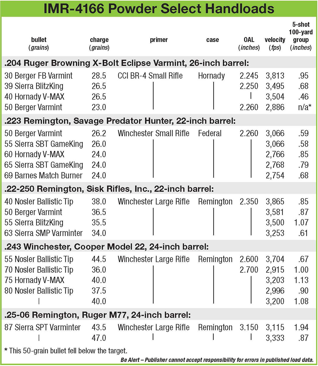 Varmint hunters are relentless experimenters, always searching for that superior load for rifles that squeezes the last dash of velocity from a cartridge and accuracy out of bullets to shoot the nap off a gnat. IMR-4166 is one powder handloaders should consider testing, because it contains several advantages from what Hodgdon calls Enduron Technology.