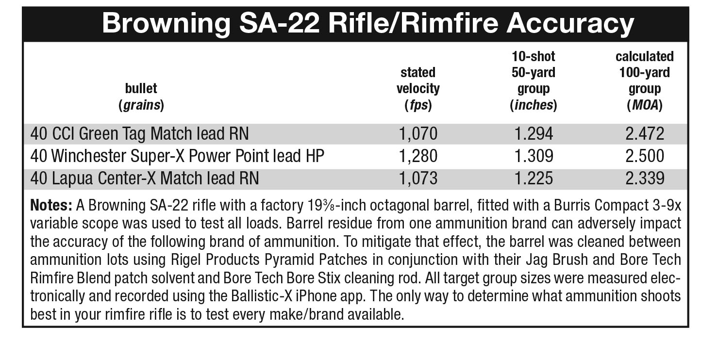 All tests were 10-shot groups fired from a Hart benchrest at 50 yards. Utilizing the SA-22’s super-quick takedown feature, the barrel was removed from the receiver and the bore cleaned using Rigel Products Pyramid Patches in conjunction with their unique Jag Brush and soaked with Bore Tech Rimfire blend cleaning solvent in-between ammunition changes. A 10-shot string was fired through the clean barrel before shooting the 10 shots for group size.