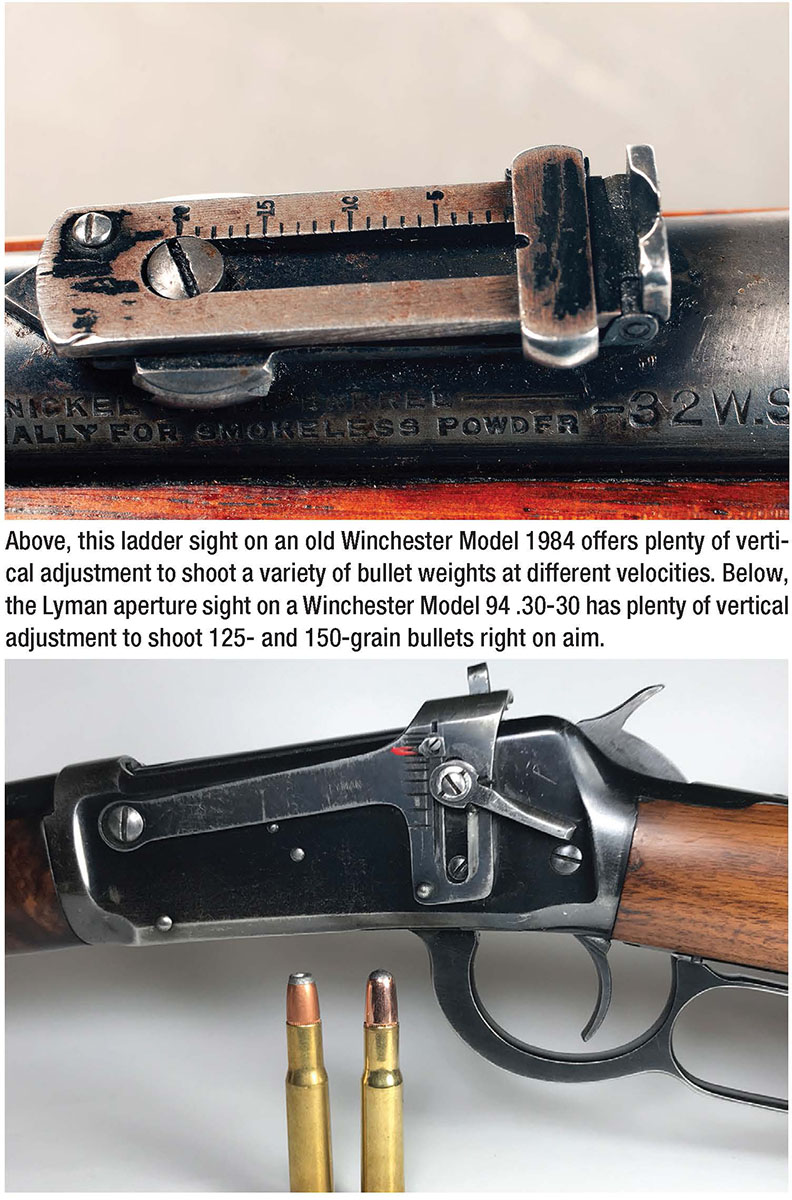 Some homework may be required to develop a suitable small-game load with a lighter-weight bullet for lever-action rifles. Keep in mind, a light bullet fired at a relatively higher velocity most likely hits higher than standard-weight bullets. A rifle with a rear aperture sight with plenty of vertical adjustment, or a scope, can easily be adjusted to compensate for that difference. Many older lever-action guns came with a rear sight that provided multiple sighting options, such as the Winchester three-leaf “express” or the Lyman Model 21 rear aperture sight on one of my Winchester Model 94 carbines. However, ordinary open sights may not have enough adjustment. Installing a taller front sight does lower bullet impact. But it is simpler to juggle bullet weight and also powder charge weight that can alter trajectory to mesh with open sights.