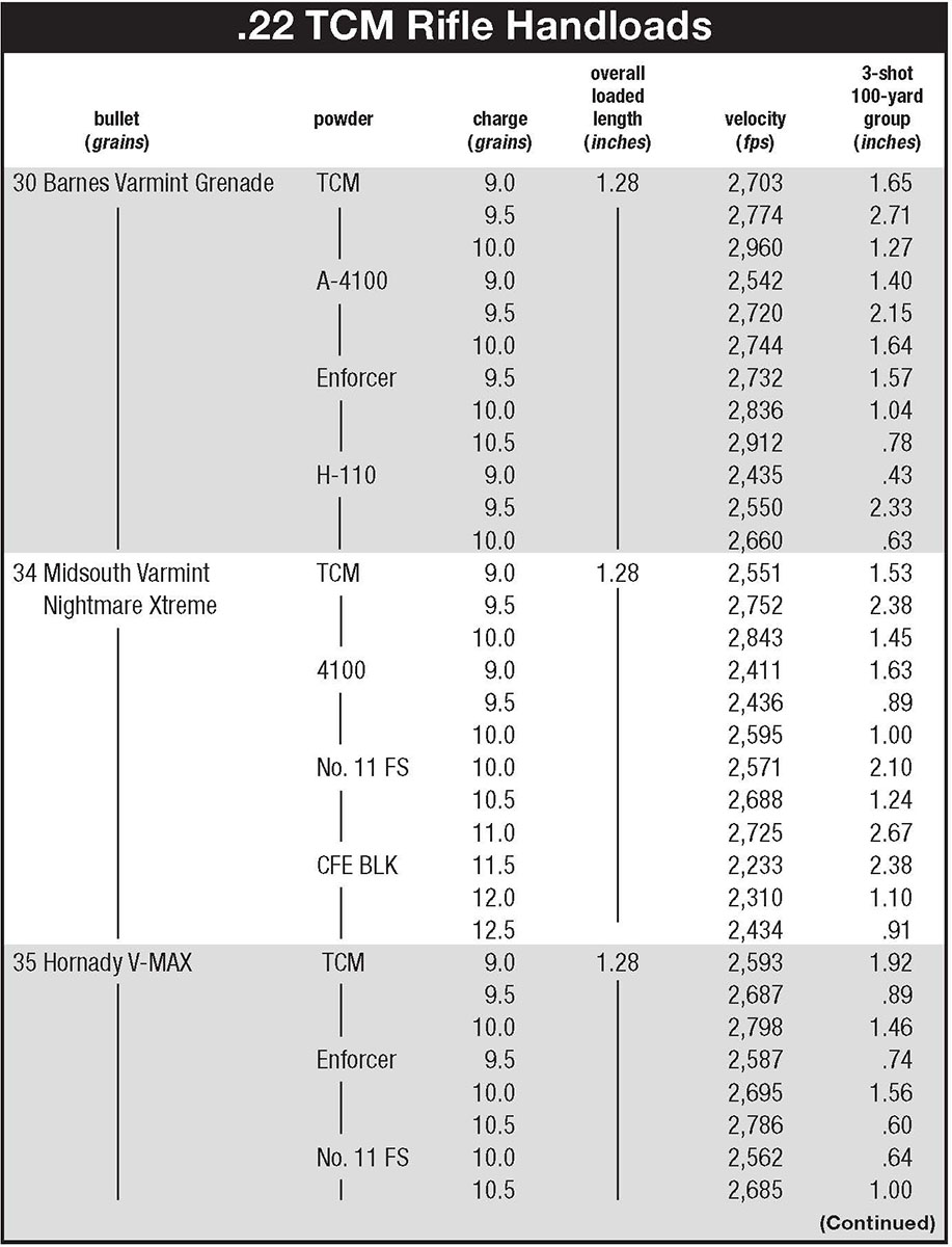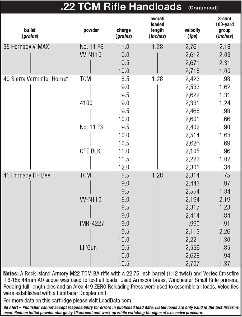 As a proprietary cartridge, the 22 TCM has not received the Sporting Arms and Ammunition Manufacturers’ Institute (SAAMI) standardization, meaning published load data is also somewhat sketchy. Western Powders’ Handloading Guide Edition 1 (Wolfe Publishing, 2017) was the only source of pressure-tested data (this for pistols) using that company’s Accurate TCM, A-4100, No. 11 FS and Enforcer handgun propellants, with maximum pressures held to around 38,000 psi or a touch more (factory loads are said to be loaded to 40,000 psi). I noticed Hodgdon recently added TCM pistol data, which mirrors Western data. Accurate TCM was developed specifically for this cartridge, so it was heavily favored during testing. Armscor seems to be the sole source of handloading brass (though range brass appeared on several internet sites) as well as the proprietary bullets already mentioned. All sites I checked were currently out of stock.