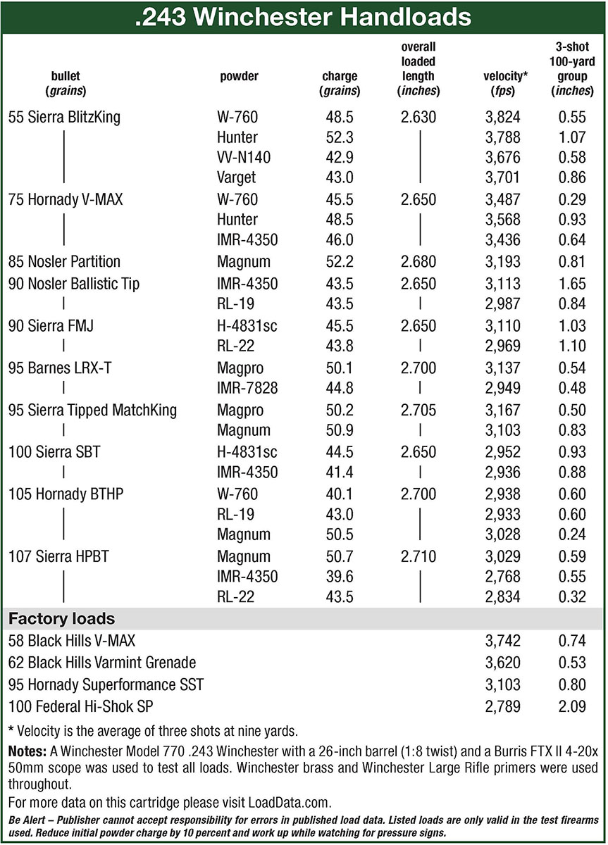 I’d had very good luck with the Sierra 90-grain FMJ in a 6x45mm AR-15 last year and hoped it would be a useful bullet for coyotes in this heavy-barreled 243. Neither Hodgdon 4831sc nor Reloder 22 managed to produce average groups that broke an inch. Later testing found the Sierra 100-grain SBT also struggling to stay under an inch.