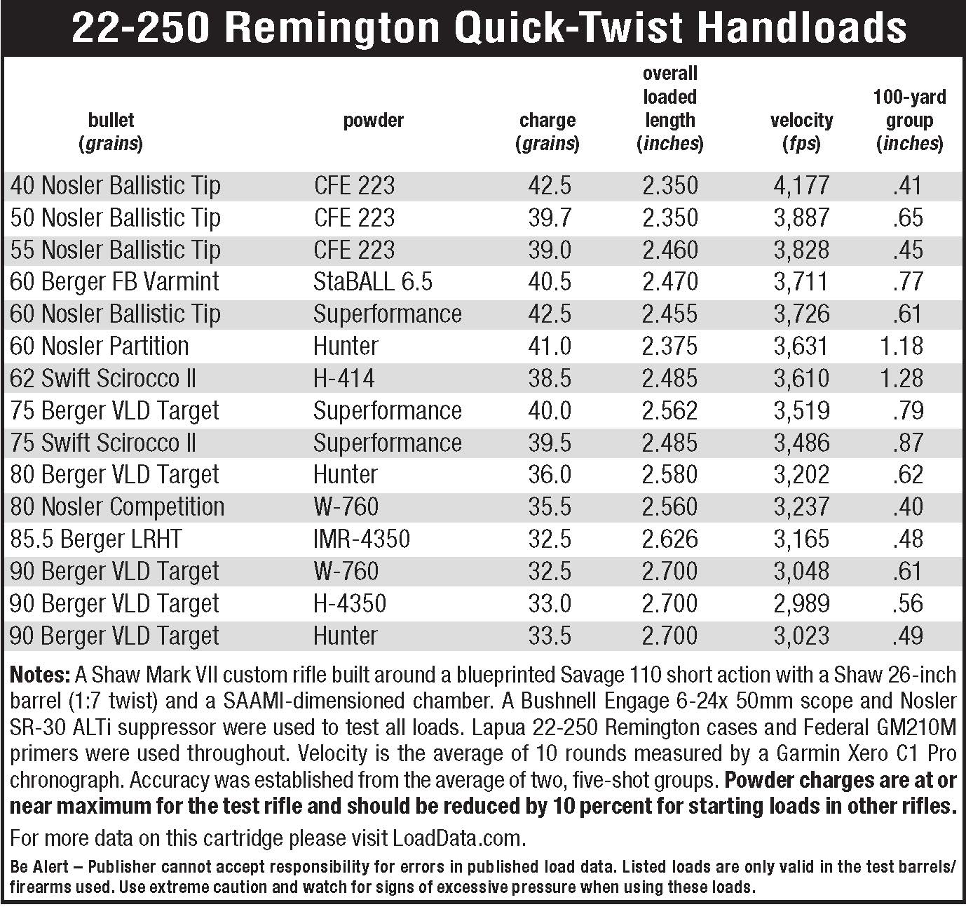 For many years, the standard bullet weight range for the 22-250 was 40 to 55 grains, and just about everybody was happy in varmint country. Then came the Nosler 60-grain Ballistic Tip, followed sometime thereafter by the Hornady V-MAX of the same weight. While some rifles shot them quite accurately, accuracy left a bit to be desired in other rifles simply because the standard 1:14 barrel twist rate bordered on being too slow. Then, .224-inch bullets got even longer. In support of across-the-course High-Power competitors who were transitioning from .30-caliber MIA rifles to AR-15s with quick-twist barrels during the 1990s, Berger introduced extremely accurate, high ballistic coefficient bullets weighing up to 90 grains. Palma and Fullbore competitors, who also were experimenting with various .22-caliber cartridges, also welcomed the new finger-long projectiles. Nosler soon joined the chase with match-grade bullets weighing 69, 77, and 80 grains and published data for them in the 223 Remington, 5.56mm NATO and the 22-250 in various reloading manuals. The earliest I have with that data was published in 2012 and the latest Nosler manual also has it. That data also benefited those who were dissatisfied with the accuracy of Nosler’s 60-grain Partition and Ballistic Tip bullets in their 1:14 twist rifles. The rifling twist rates of the company’s test barrels for bullets weighing from 60 to 80 grains was 1:8.