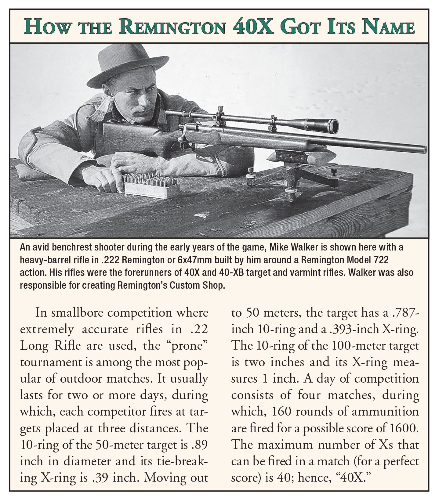 The story actually began around 1950. Among a number of interesting things, Mike Walker was in charge of designing the Remington Model 721 (long action) and the Remington Model 722 (short action) centerfire rifles, both introduced in 1948. A successful benchrest competitor, he won a number of matches with heavy-barrel, single-shot rifles in 222 Remington and 6x47mm on Model 722 actions. Eliminating the magazine box cutout in the receiver increased rigidity for an improvement in accuracy. Another of his experimental rifles on the Model 722 action was chambered for the .22 Long Rifle.
