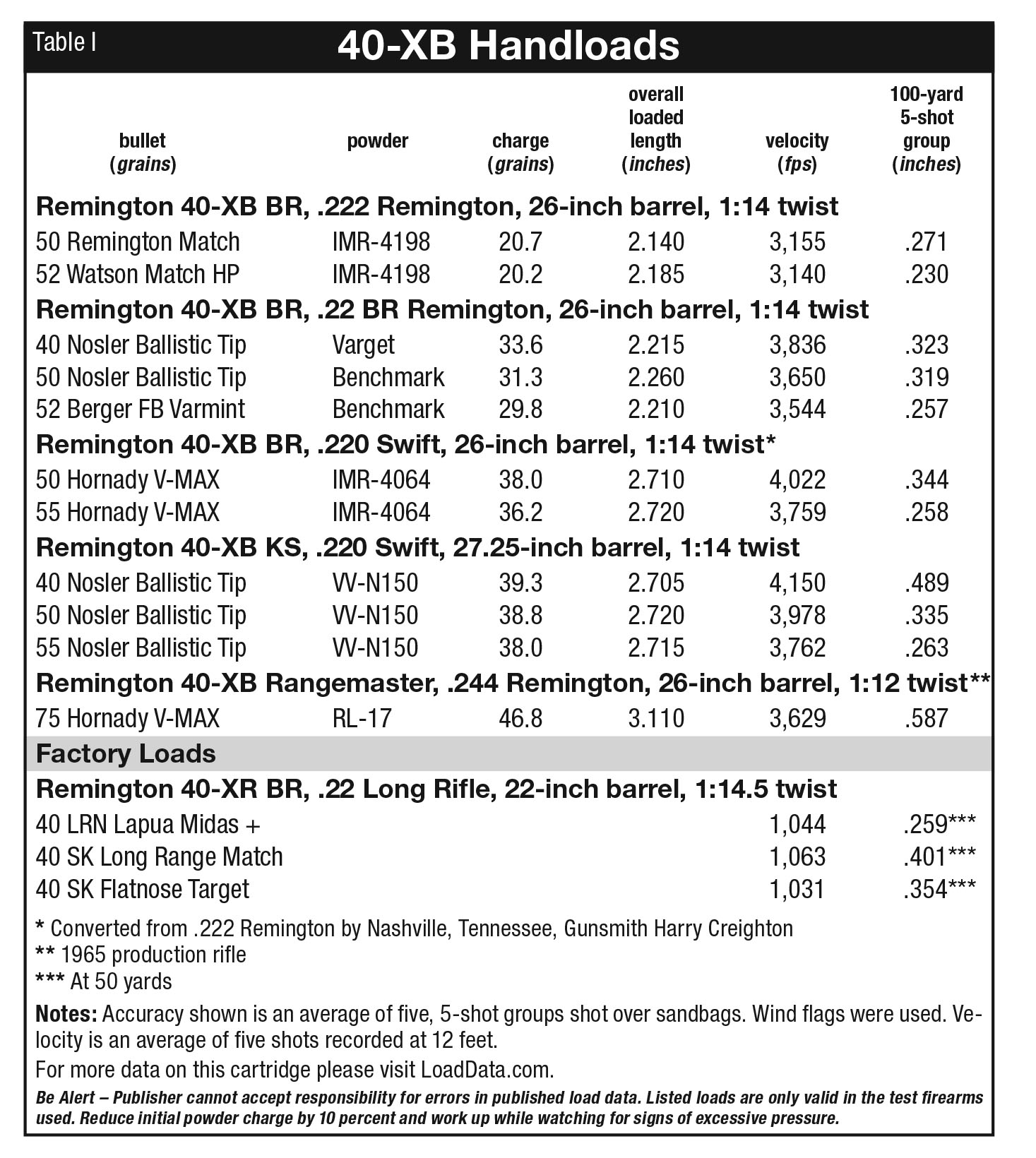 For about four decades, the 40-XB and the earlier 40X, built by talented craftsmen in Remington’s Custom Shop, was the most accurate factory-built centerfire rifle in America. Like delicious icing on an irresistible cake baked by a master at his craft, it was available in a number of super-accurate cartridges suitable for bumping off varmints of various sizes at great distances. In order to escape the factory, a rifle had to deliver a certain level of accuracy for five-shot groups on a 100-yard indoor range. Accuracy was verified to the customer by including test targets with each rifle shipped. For many years, the accuracy delivered by each rifle was recorded and a tally was kept on the average accuracy of all rifles built in each caliber. The last time I checked, the overall average for several hundred rifles in 222 Remington was .373 inch.