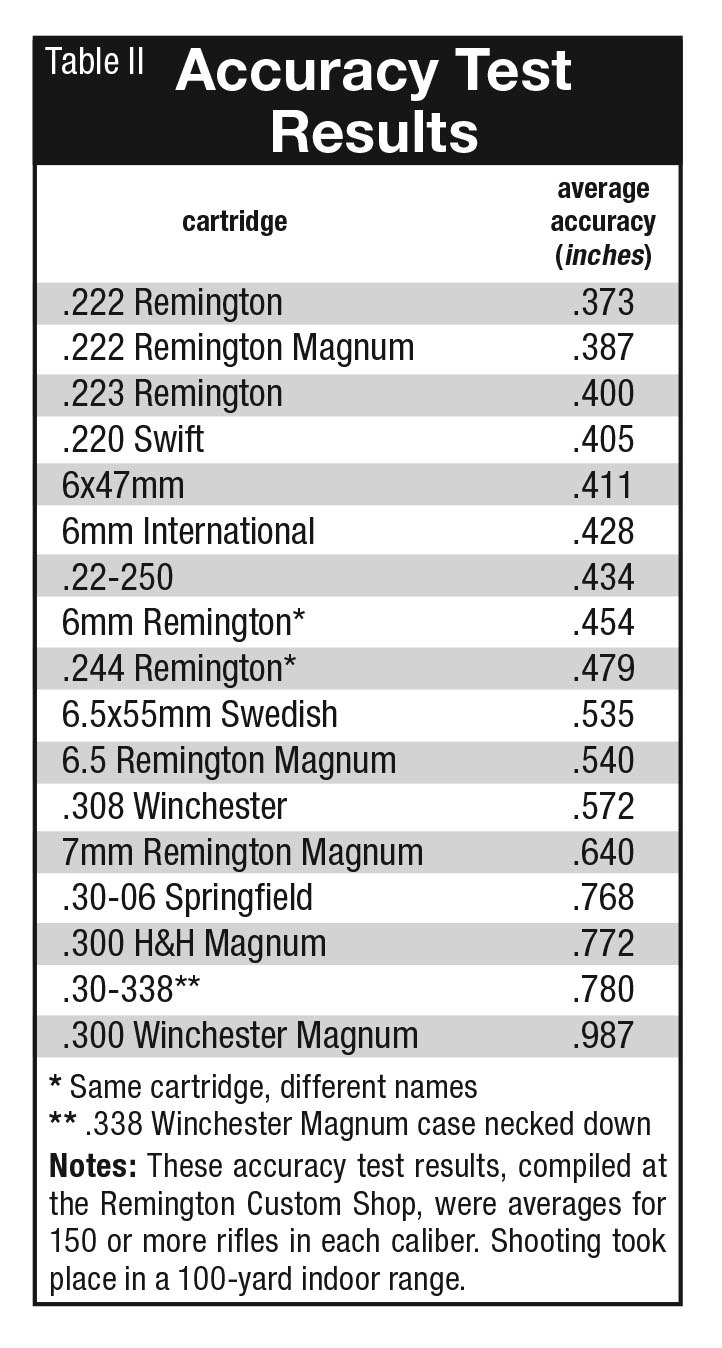 In this article, I have included a table compiled by Remington on the average accuracy of 17 different cartridges, and while not all are entirely suitable for varmint shooting, the information is interesting just the same. While impressive, those test results were misleading because the exact same handload was used to accuracy-test all rifles of a particular caliber. For many years, the 222 Remington recipe consisted of the Remington 6½ primer, Remington case and a custom, 52-grain bullet seated atop 20.3 grains of IMR-4198. Developing a precision handload specifically for a particular rifle almost always resulted in considerably smaller groups than those shot by Custom Shop personnel.
