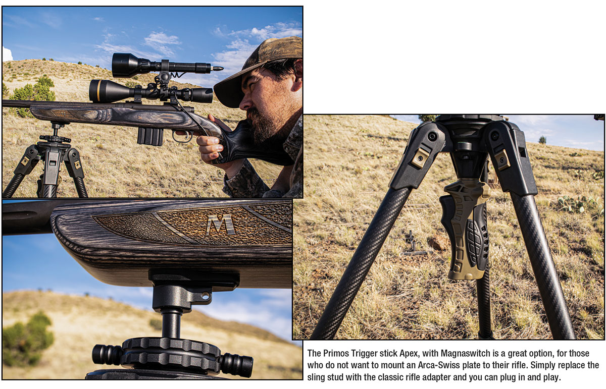 Hunting varmints at night has shown how valuable a tripod can be for nighttime calling sessions. Making a shot in the daytime is not always easy, but making a shot at night is even more difficult. This is especially true on a coyote that is typically moving as it requires practice and patience and above all – repetition to become proficient at it. Using a good tripod is just another piece of gear that makes it a little easier. These days, it is not difficult to have an Arca-Swiss plate added to a rifle stock or the forend of an AR-15. However, if adding such things to your setup seems a little too tactical or gaudy-looking, Primos has a good option with its new Trigger Stick Apex tripod with Magnaswitch. It is as simple as swapping out the sling swivel with the classic rifle adapter, which has a sling swivel stud built in. This setup has been used with good success in the field and also, it is quick and easy to set up. The addition of a stable shooting platform such as a tripod is probably one of the best additions a shooter can add to a budget setup.