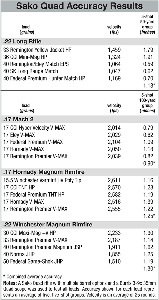 Five Quad model variations have been available, all with 24-inch, six-groove barrels. The Quad Synthetic with a black stock has a standard-weight barrel while the Synthetic Heavy Barrel has, you guessed it – a heavier barrel. Replace the synthetic stock of the latter model with European walnut and you have the Quad Varmint. Give that one fancy walnut, adjustable open sights and a single set trigger and you have the Hunter Pro. The Range model is described by Sako as a target rifle, and in addition to a single set trigger it has a laminated wood stock with a height-adjustable cheek rest.