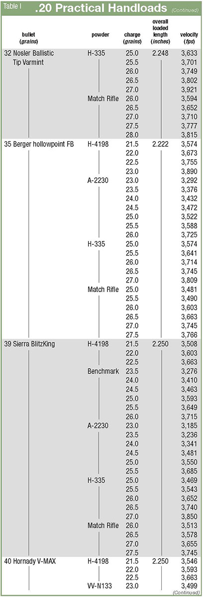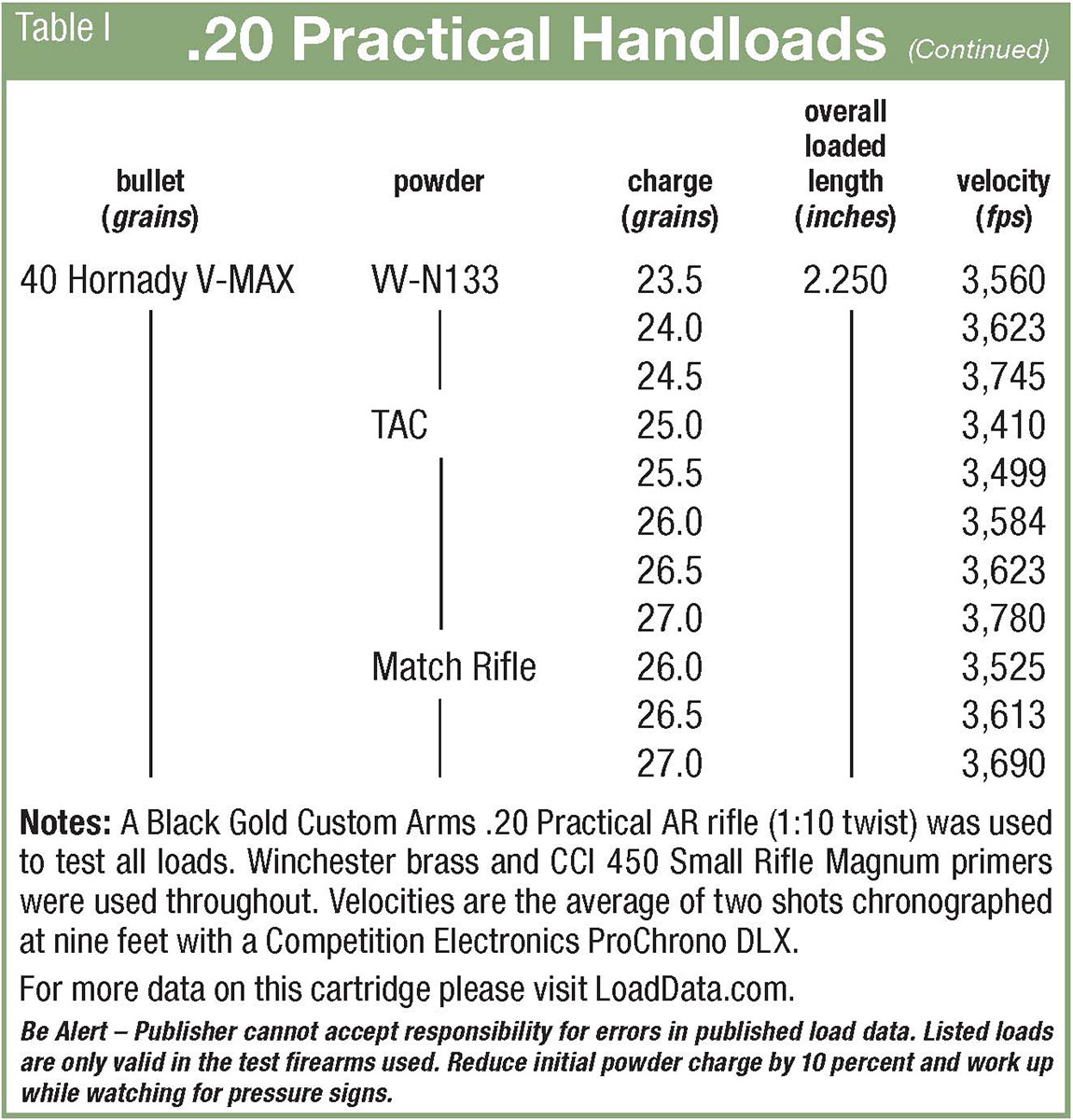 Both Hodgdon and Western Powders have pressure tested data for the 20 Tactical. Hodgdon’s data was created using the SAAMI 55,000 psi maximum pressure limitation set for the 223 Remington. Western Powders’ data was created using the CIP (Commission Internationale Permanente, the European governing body regarding firearms and cartridges) pressure maximum for the 223 Remington, which is 62,366 psi. Either standard is reasonable, but 62,000 psi provides noticeably higher velocities.
