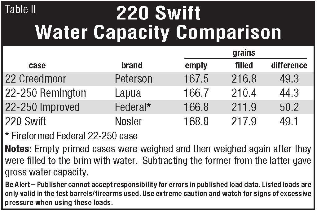 So how does the old-timer stack up against its competition? As can be seen in a capacity comparison table included in this report, Nosler 220 Swift and Peterson 22 Creedmoor cases hold the same amount of water. Both have a bit less capacity than the 22-250 Improved and a bit more than the standard 22-250 case. With all loaded to the same pressures, the 220 Swift case can require trimming more often, although neck-sizing only for as many firings as possible puts it on equal footing in that department with the others.